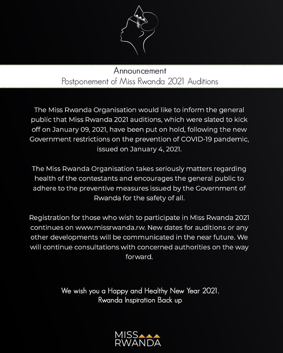 Rwanda Inspirationa Back Up (RIB) itegura irushanwa rya Miss Rwanda yasohoye itangazo ahagana saa mbili kuri uyu wa Kabiri tariki 05 Mutarama 2021 imenyesha ko "amajonjora y’ibanze yari ateganyijwe gutangira ku itariki 09 Mutarama 2021 mu Ntara y’Iburengerazuba abaye asubitswe, mu rwego rwo kubahiriza amabwiriza mashya yo kwirinda icyorezo cya Coronavirus nk’uko byemejwe n’Inama y’Abaminisitiri yo ku wa 04 Mutarama 2021."