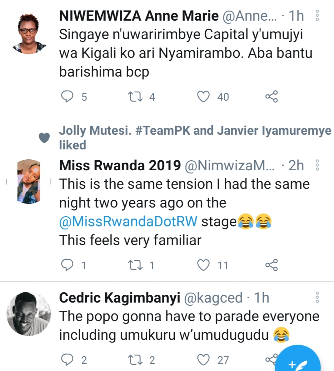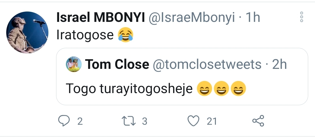 Abakoresha imbuga nkoranyambaga nabo ntibatanzwe ahubwo bagaragaje ibyishimo bafite ku bw'Amavubi yabahaye ibyishimo baherukaga kera, benshi bandika amagambo yiganjemo arimo urwenya - mu kumvikanisha cyane ibyishimo bafite, aho hari nk'uwavuze ngo Sugira Ernest akwiye guhabwa KCC, undi avuga ko uyu mukinnyi ahawe byose birimo na RwandAir. Tom Close yanditse ko Togo 'bayitogosheje', Dj Pius asetsa abantu avuga ko Sugira ngo benshi bakunze kumwita Dj Pius, hari n'abavuze ngo ubu noneho bakwemera kurara muri Stade babyina intsinzi.