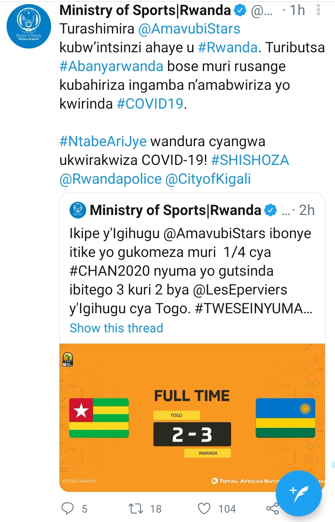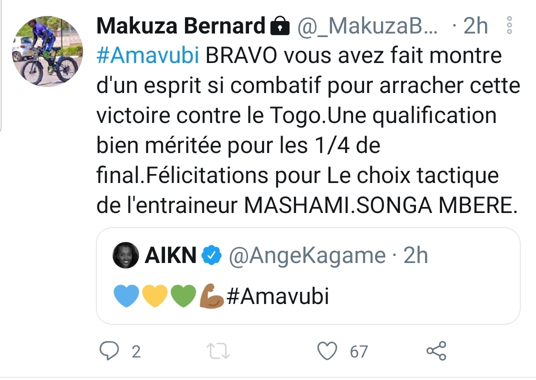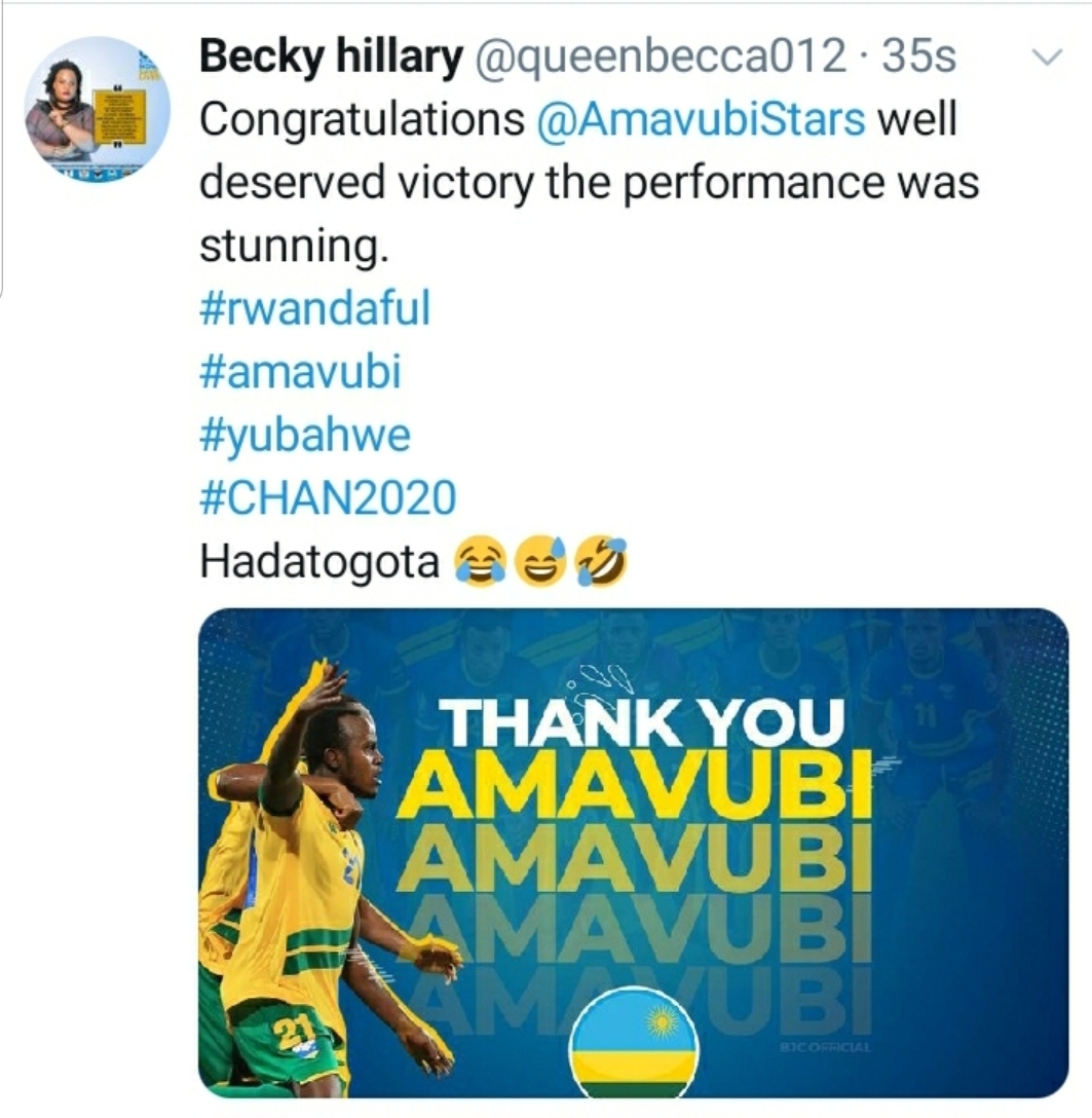 Nyuma yo kugenzura neza bakamenya intandaro y'ibyishimo, bahise nabo bandika bati 'Thank you Amavubi' bisobanuye ngo 'Mwakoze Amavubi'. Ni intsinzi yatanze ibyishimo mu gihugu hose ndetse abanyarwanda ntibazuyaje, bahise babyerekana barara ijoro ryose babyina baririmba bishimye, intero n'inyikirizo ari imwe, 'Mwakoze Amavubi'. Muri 1/4 Amavubi azakina n'ikipe izaba iya mbere mu itsinda rya D ririmo Guinnea, Zambia, Tanzania na Namibia.