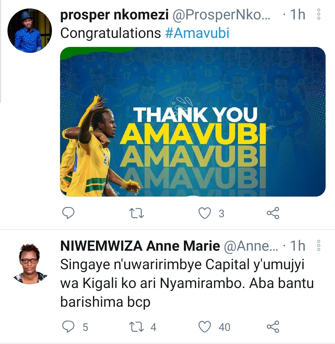 Akaruru karengana, imbyino zisubiramo amazina y'abakinnyi b'Amavubi bari Jacques, Kwizera, Niyonzima na Sugira nizo zumvikanye mu bice bitandukanye by'umujyi wa Kigali, byaherekezwaga n'amashyi menshi abikiriza y'abari hamwe n'abatari hamwe bataka ubutwari Amavubi.