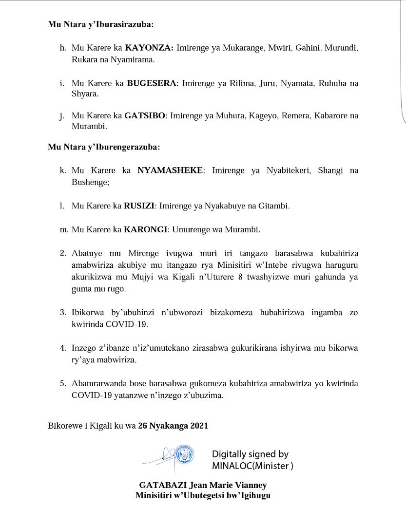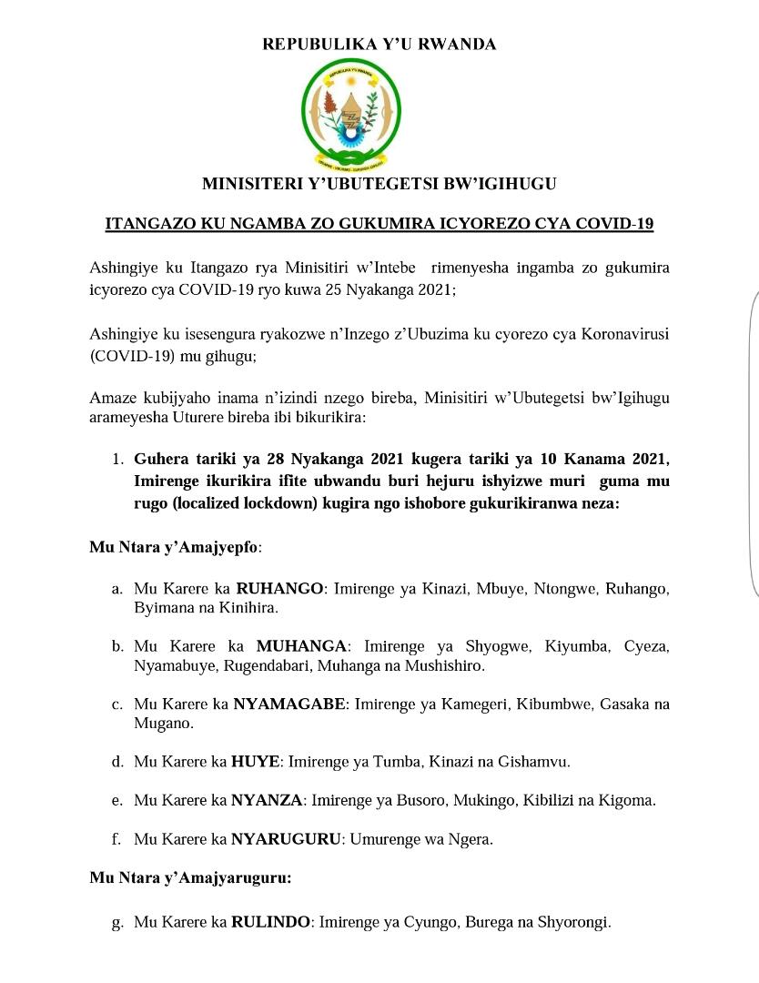 Ni itangazo ryateweho umukono na Hon. Gatabazi Jean Marie Vianney Minisitiri w'Ubutegetsi bw'Igihugu ashingiye nawe ku itangazo rya Minisitiri w'Intebe rimenyesha ingamba zo gukumira icyorezo cya Covid-19 ryo kuwa 25 Nyakanga 2021 anashingiye kandi ku isesengura ryakozwe n'Inzego z'ubuzima bireba. Minisitiri Gatabazi yavuze ko "Guhera tariki 28/07/2021 kugeza tariki ya 10/08/2021, Imirenge imwe n'imwe ifite ubwandu buri hejuru ishyizwe muri 'Guma mu rugo' kugira ngo ishobore gukurikiranwa neza".