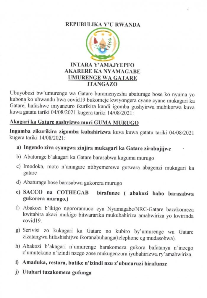 Ingamba zagombaga gukurikirizwa harimo ko 'ingendo ziva cyangwa zinjira mu kagari ka Gatare zirabujijwe', Abaturage b'Akagari ka Gatare barasabwa ku Guma mu Rugo, imodoka, moto n'amagare ntibyemerewe gutwara abagenzi mu kagari ka Gatare....