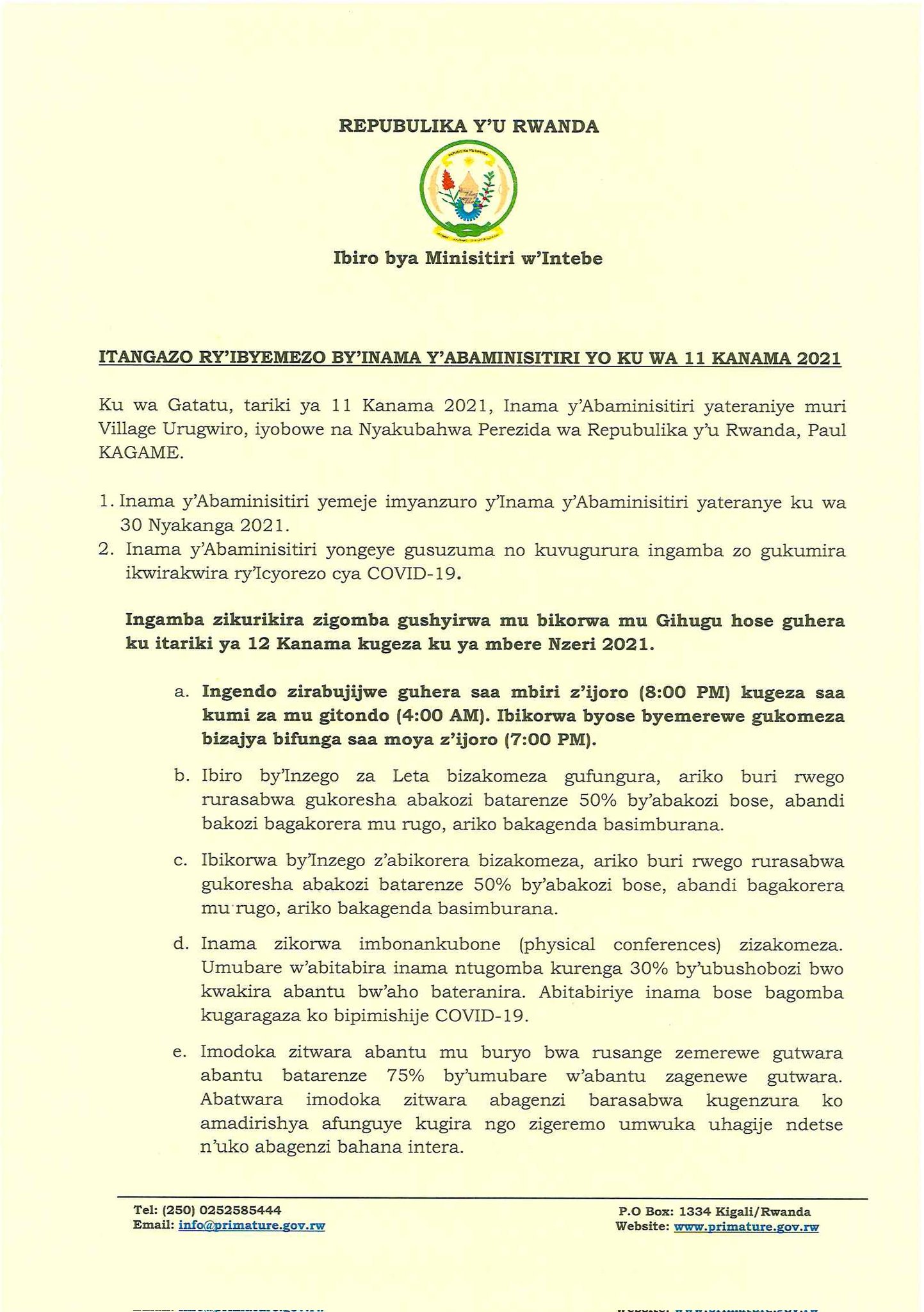 Ku bijyanye n'isaha yo kugera mu ngo yagizwe saa Mbiri z'ijoro mu gihe yari isanzwe ari saa Kumi n'Ebyiri z'umugoroba, itangazo ry'ibyemezo by'Inama y'Abaminisitiri riragira riti "Ingendo zirabujijwe guhera saa mbiri z'ijoro kugeza saa kumi za mu gitondo. Ibikorwa byose byemerewe gukomeza gukora bizajya bifunga saa Moya z'ijoro". Iyi nama yemeje kandi ko imodoka zitwara abantu mu buryo bwa rusange zemerewe gutwara abantu batarenze 75% by'umubare w'abantu zagenewe gutwara.