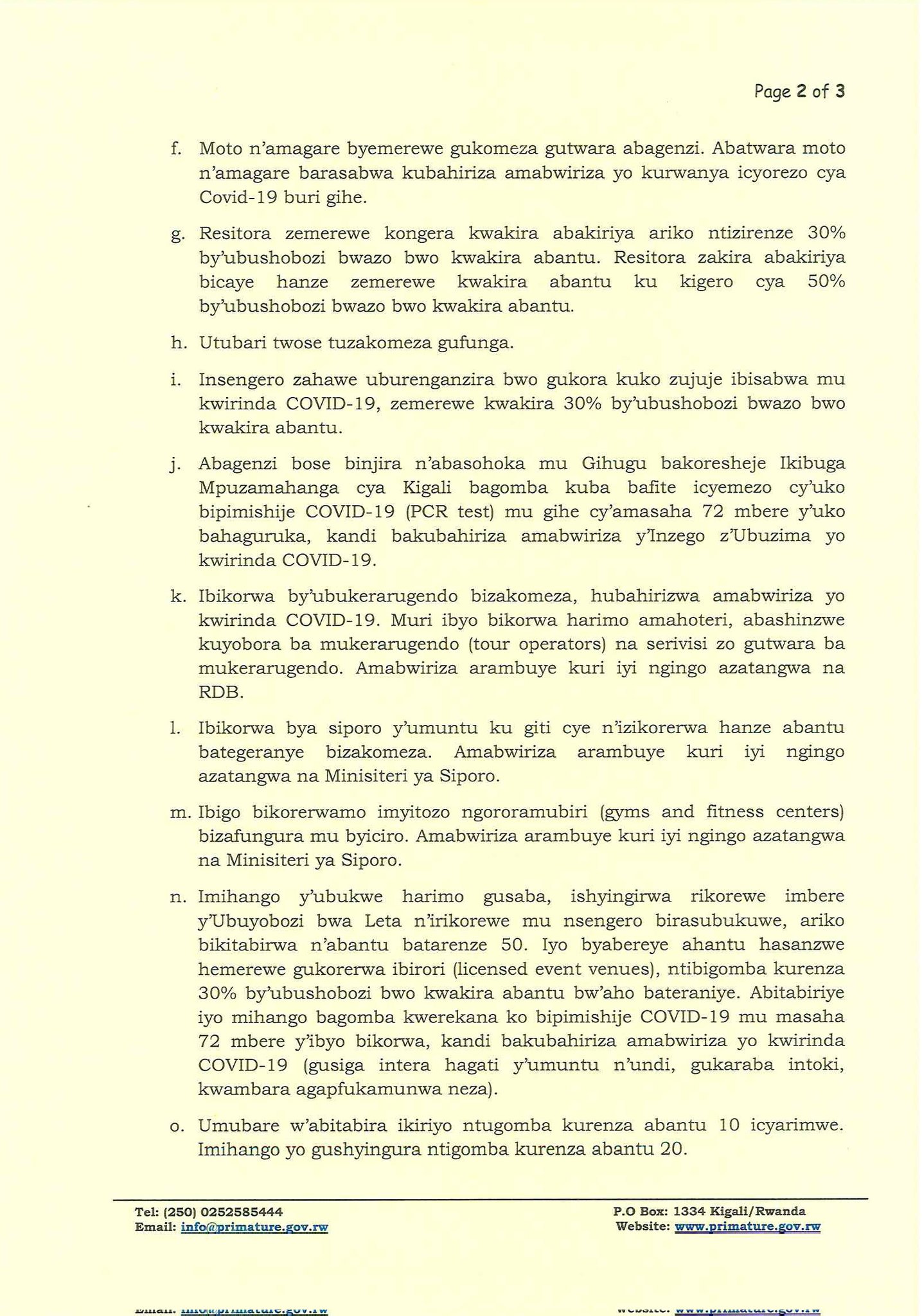 Umubare w'abitabira ikiriyo ntugomba kurenza abantu 10 icyarimwe. Imihango yo gushyingura ntigomba kurenza abantu 20. Ibikorwa by'inzego z'abikorera bizakomeza, ariko buri rwego rurasabwa gukoresha abakozi batarenze 50% by'abakozi bose, abandi bakozi bagakorera mu rugo, ariko bakagenda basimburana. Iyi nama yemeje kandi ko ibikorwa by'ubukerarugendo bizakomeza hubahirizwa amabwiriza yo kwirinda Covid-19. Muri ibyo bikorwa harimo amahoteli, abashinzwe kuyobora ba mukerarugendo, na serivisi zo gutwara ba mukerarugendo. Amabwiriza arambuye kuri iyi ngingo azatangwa na RDB.