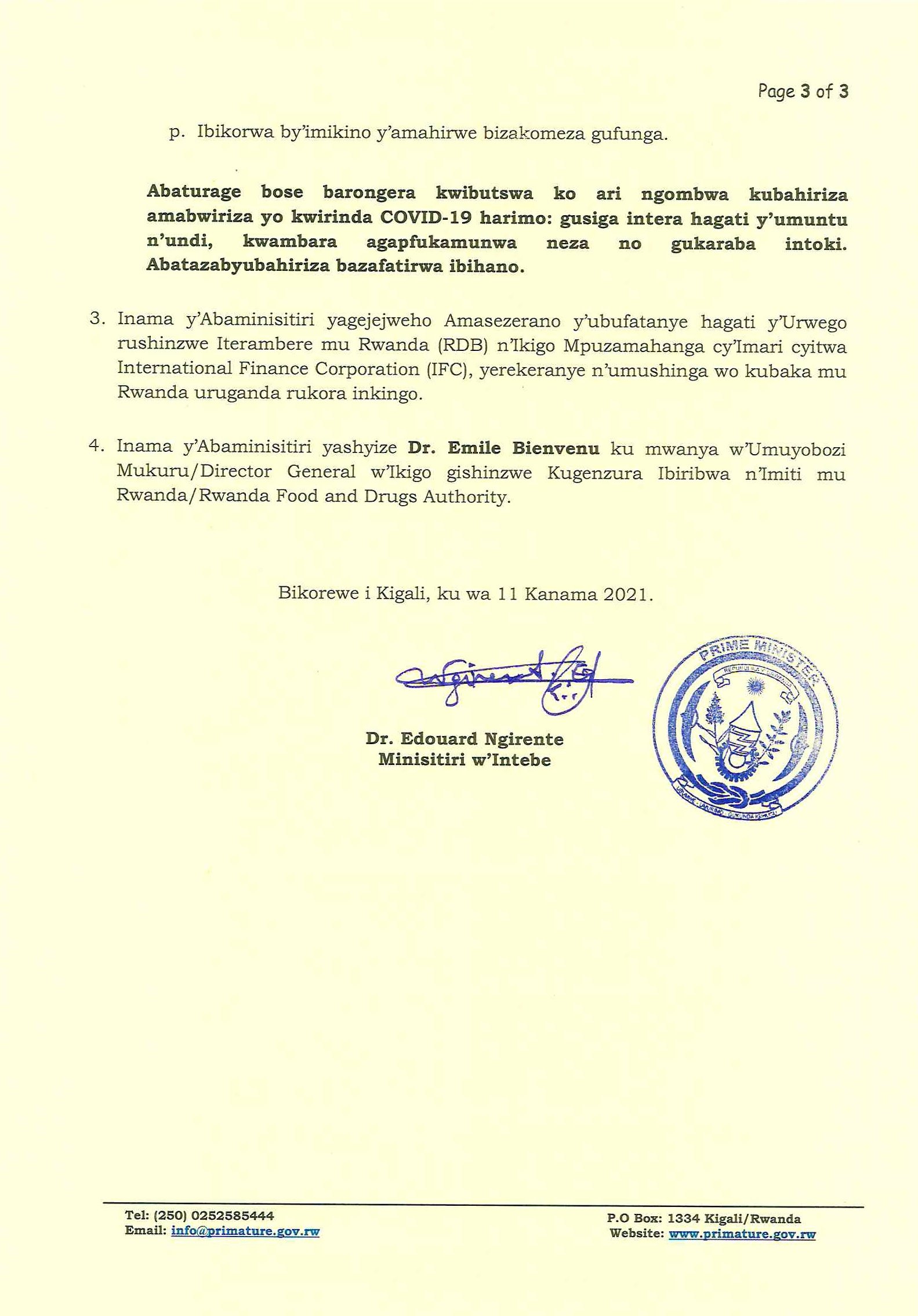 Itangazo ry'Ibyemezo by'Inama y'abaminisitiri yateranye kuri uyu wa Gatatu