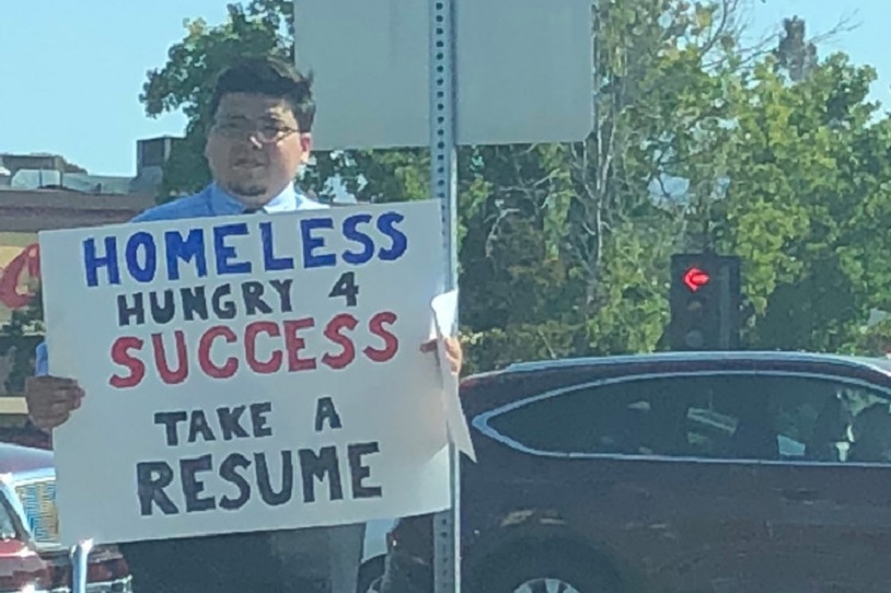 Nyuma yo gusoza kwiga akabura akazi, yigiriye inama maze afata icyapa cyanditseho ubuzima bubi abayeho, ajya mu muhanda kugira ngo asabe ubufasha ngo byibura arebe ko hari n’uwamuha akazi. Ibi yabikoze mu 2018.