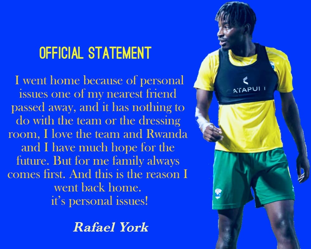 Umukinnyi wo mu kibuga hagati mu ikipe y'igihugu Amavubi, Rafael York, yatangaje ko ibibazo by'umuryango we aribyo byatumye ava mu ikipe y'igihugu Amavubi.
