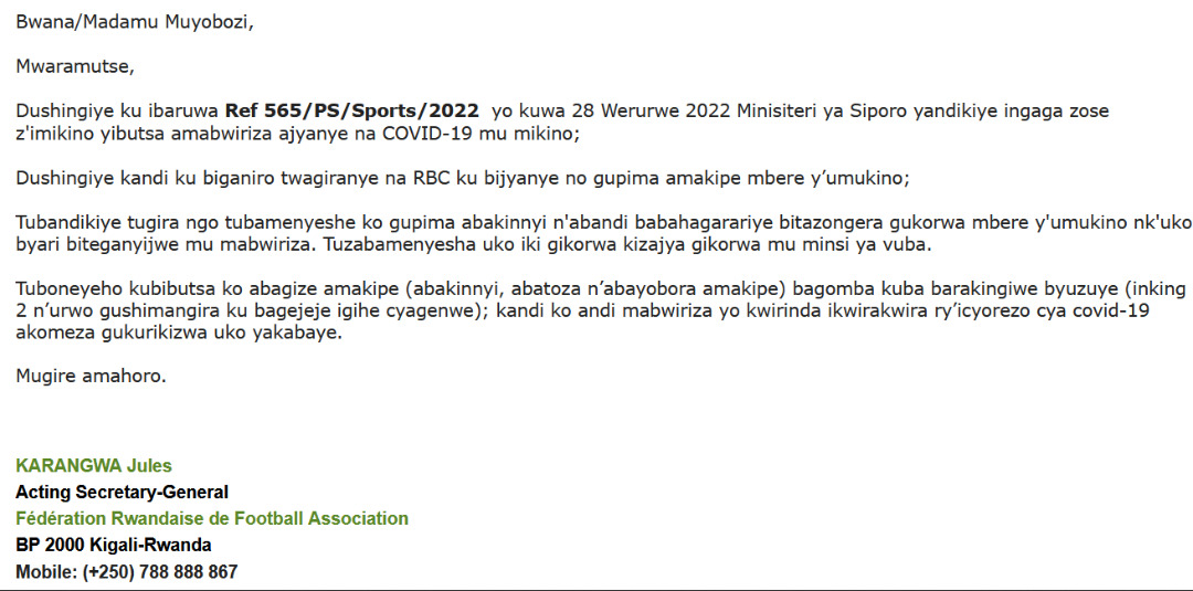 ry'umupira w'amaguru mu Rwanda FERWAFA ryandikiye amakipe, ryabamenyesheje ko
