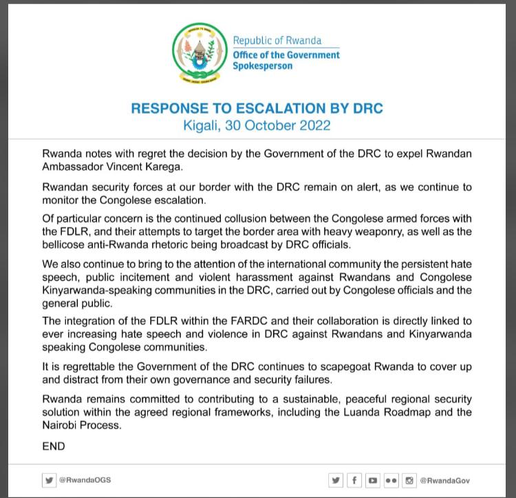Itangazo Guverinoma y'u Rwanda yasohoye uyu munsi ku Cyumweru tariki ya 30 Ukwakira 2022, yatangaje ko yababajwe n'umwanzuro wo kwirukana Ambasaderi w'u Rwanda, wafashwe na Leta ya Repubulika Iharanira Demokarasi ya Kongo.