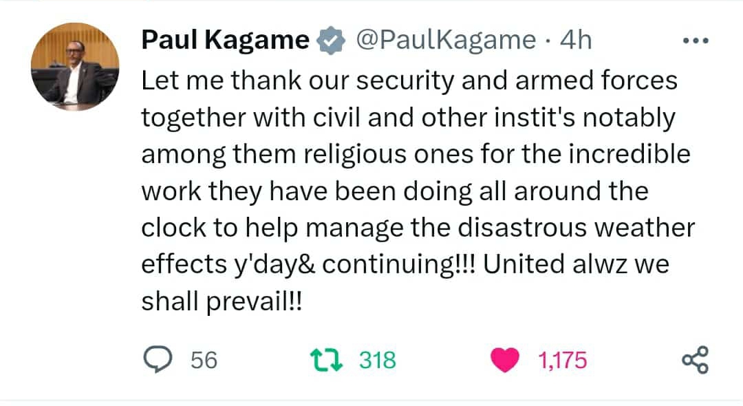 Perezida Kagame kandi yanashimiye byimazeyo inzego ziri guhangana n'ingaruka zibi biza. Mu butumwa yanyujije kuri Twitter yanditse ati: "Reka nshimire inzego z'umutekano wacu n'ingabo zacu hamwe n'abaturage ndetse n'ibindi bigo birimo cyane cyane abanyamadini ku bikorwa bidasanzwe bagiye bakora amasaha yose kugira ngo bafashe mu guhangana n'ingaruka mbi zatewe n'ibiza ku munsi w'ejo kandi bigikomeza !!! Ubumwe buri gihe tuzatsinda !!".