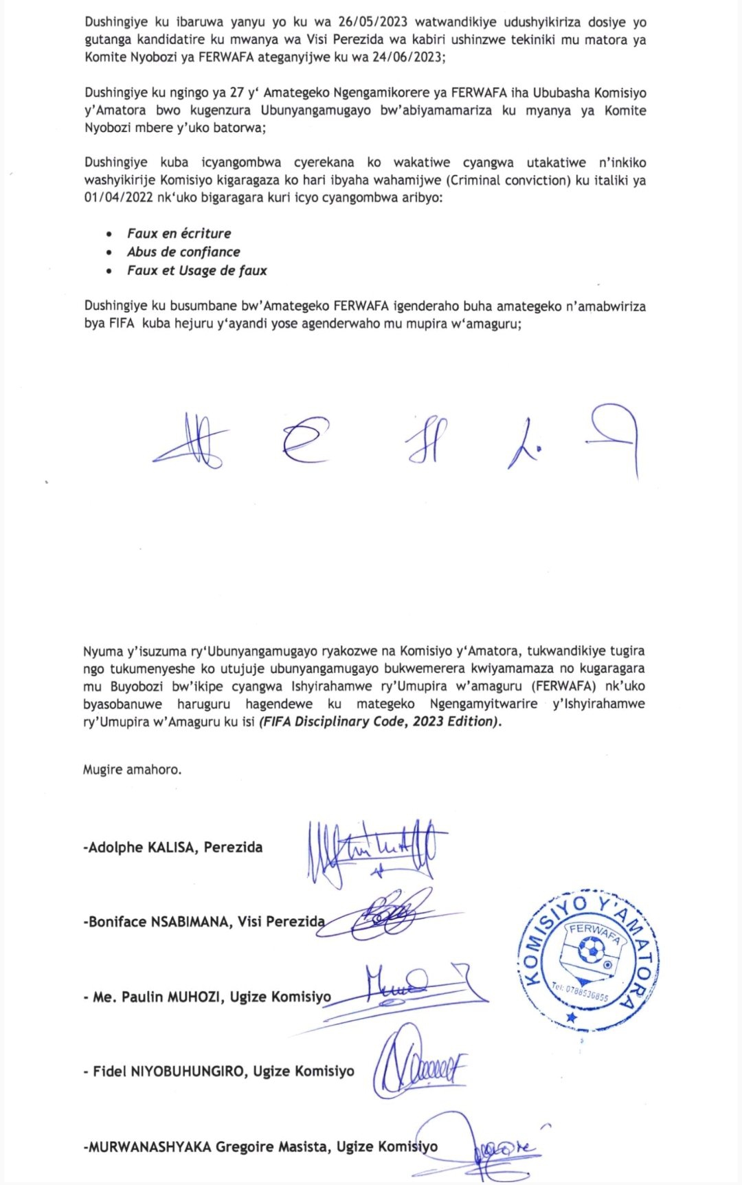 ndetse n'icyemezo cy'umunyamuryango wa FERWAFA umutanzeho umukandida.