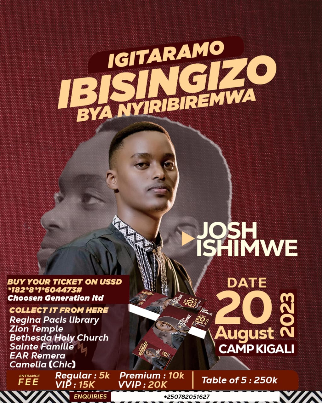 Josh Ishimwe afite igitaramo mu mpera z’iki cyumweru - ni cyo cya mbere azaba akoze, akaba azataramana n’abakunzi be. Ni igitaramo yise “Ibisingizo bya Nyiribiremwa " kizaba ku Cyumweru tariki 20/08/2023 muri Kigali Conference and Exhibition Village ahazwi nka Camp Kigali.