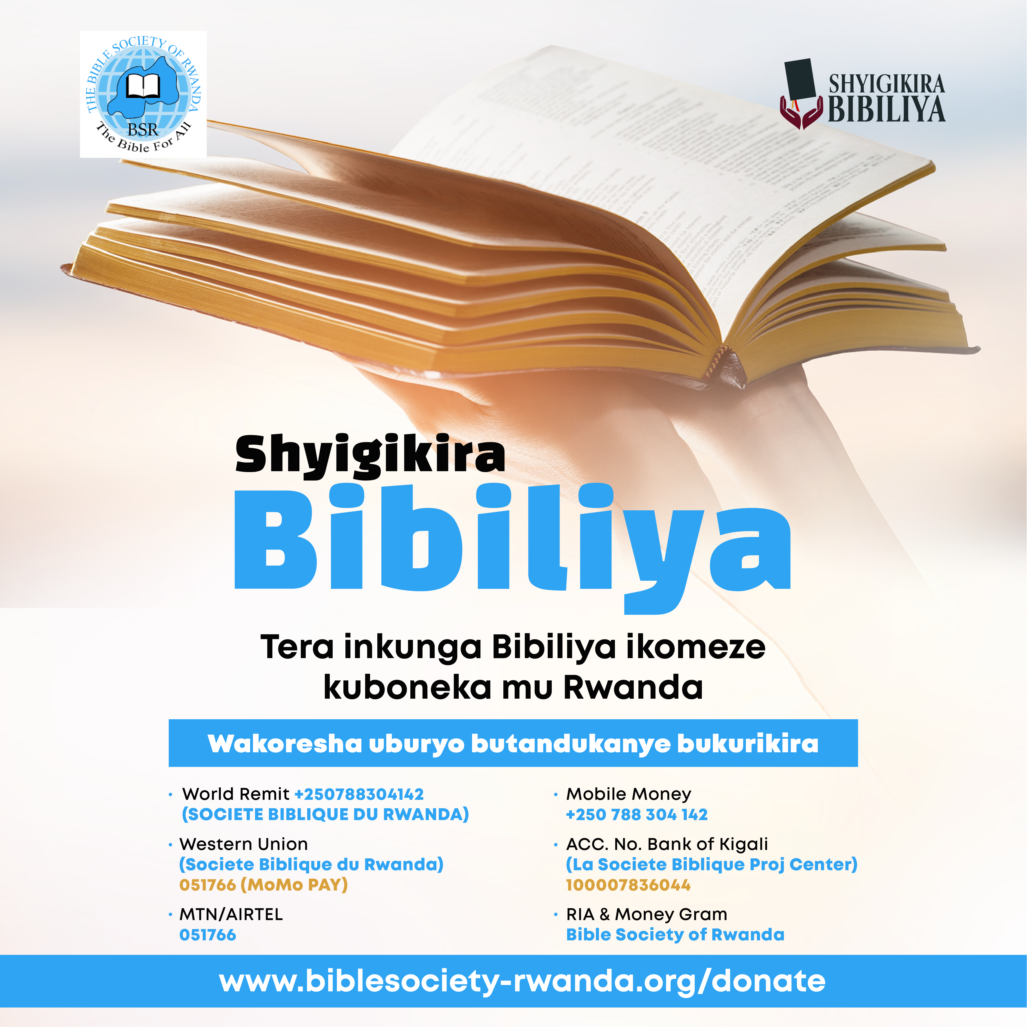 Mobile Money: +250788304142; Bank of Kigali (La Societe Biblique Proj Center) 100007836044; RIA & Money Gram (Bible Society of Rwanda). Ushobora no kunyura ku rubuga www.biblesociety-rwand.org/donate, ugatanga inkunga yose ufite.