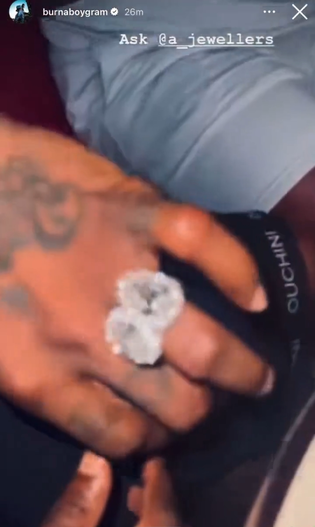 Burna Boy yongeye gutungura abantu mu gihe n'ubundi bari bakigaruka kuri uwo mukufi ahita agaragaza impeta yaguze million ebyiri z'amadorali (2293280000.00 Rwf).