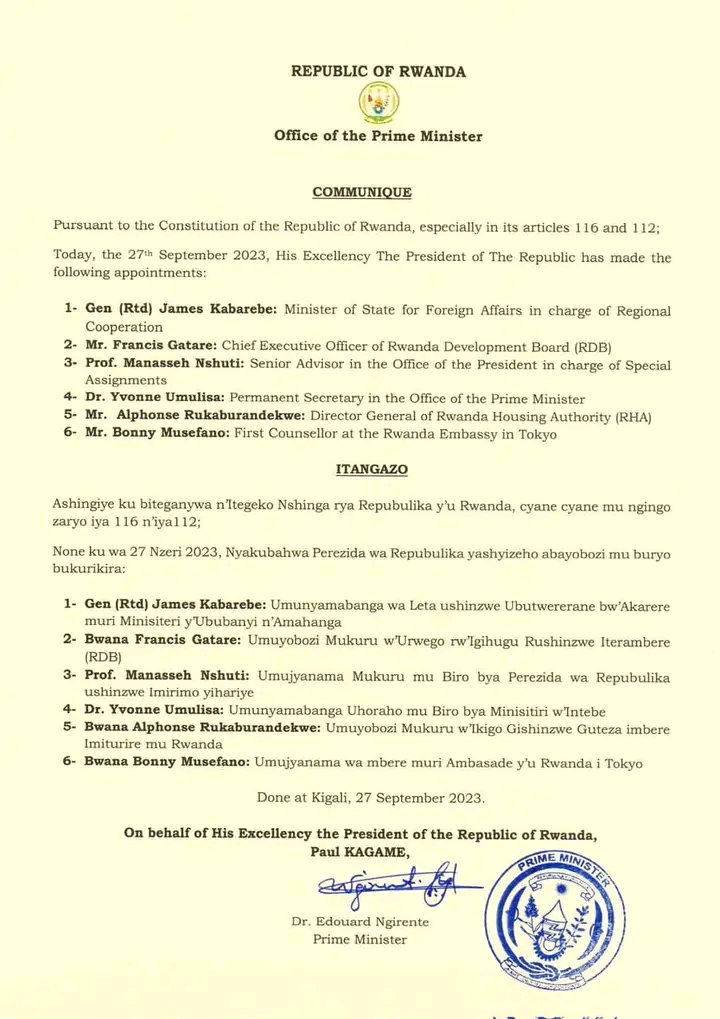 Dr. Yvonne Umulisa agirwa Umunyamabanga Uhoraho mu Biro bya Minisitiri w’Intebe. Alphonse Rukaburandekwe yagizwe Umuyobozi Mukuru w'Ikigo Gishinzwe Guteza imbere Imiturire mu Rwanda.Bonny Musefano agirwa Umujyanama wa Mbere muri Ambasade y'u Rwanda i Tokyo.