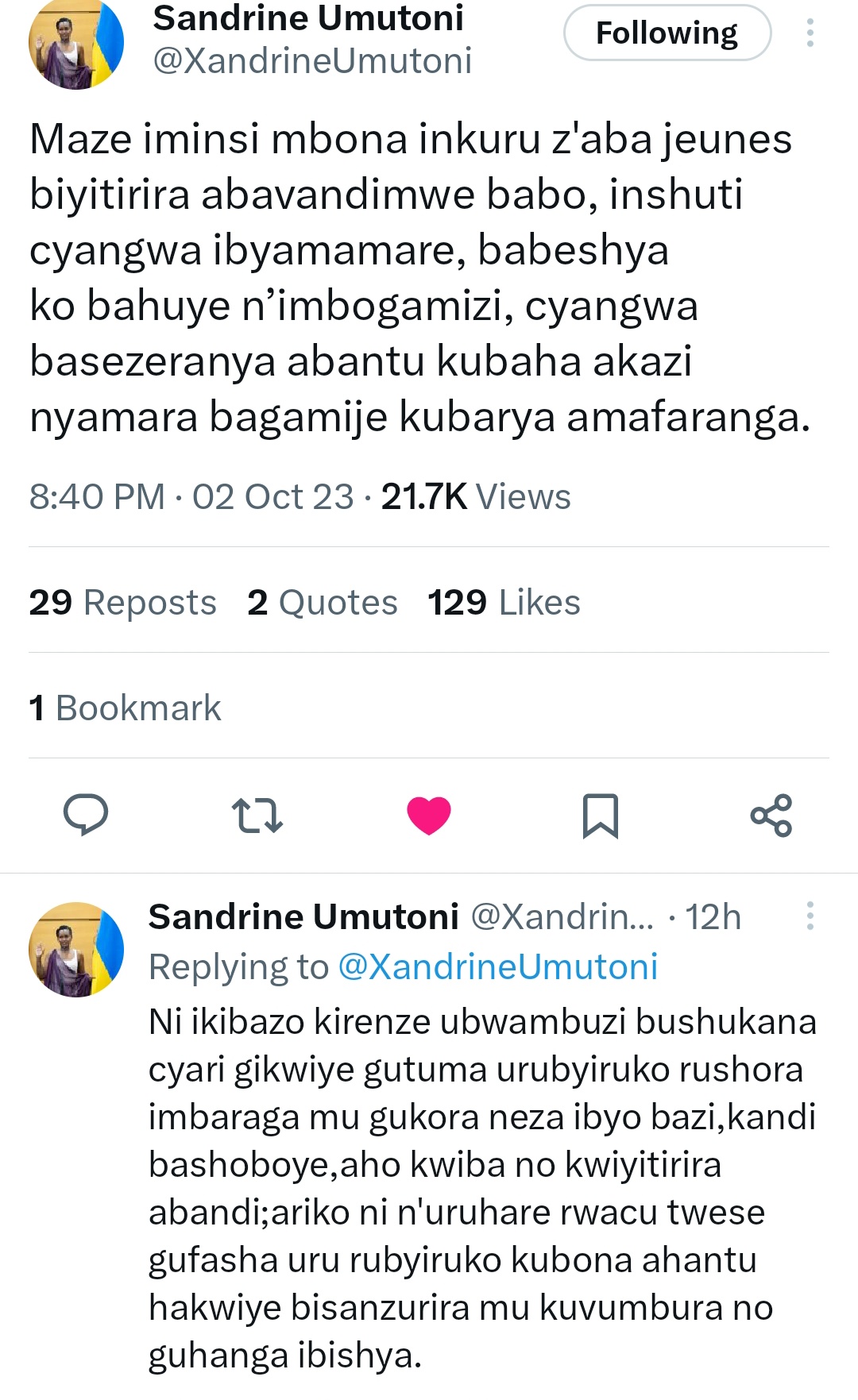 Twitter, Umunyamabanga wa Leta muri Minisiteri y'Urubyiruko, Umutoni Sandrine,