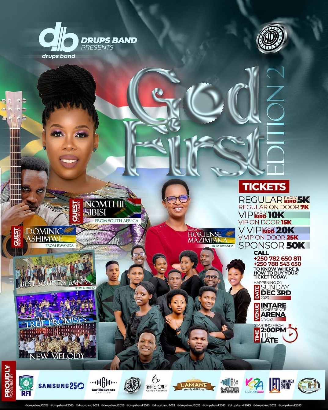 Igitaramo ngarukamwaka cyiswe ‘God First,’ kizaba ku cyumweru tariki 3 Ukuboza 2023. Drups Band bijeje abantu ko ku isaha y’i saa munani kizaba gitangiye aho kizabera kuri Intare Arena ya Gisozi iherereye haruguru gato y'Agakinjiro iruhande rw'Amashuri ya APAPEC, kikarangira saa mbili zuzuye z’ijoro.
