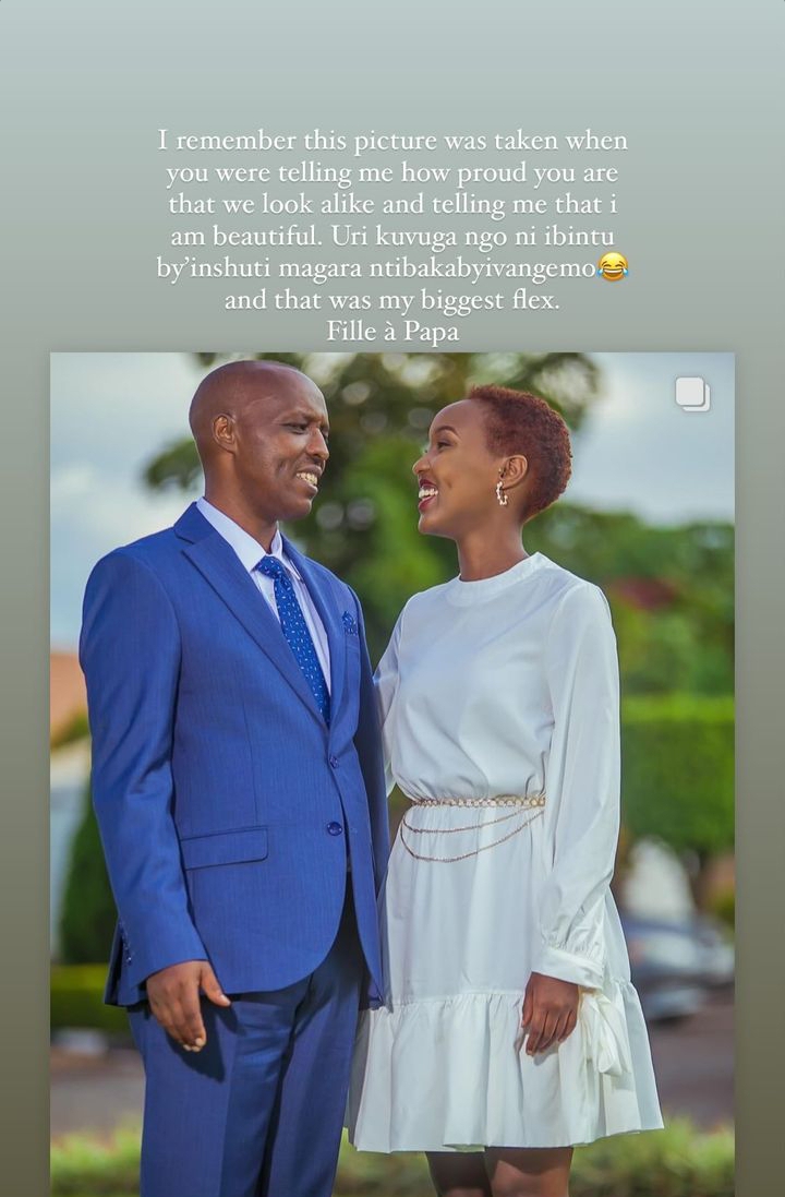 Warankunze urukundo rwawe ndarwumva ruraseseka n'abatubona bakifuza umubano dufitanye. Wanyigishije ibintu byinshi ndetse igikuru umpa Kristo ariwe mpano ikomeye, kuko ntabwo nzi uko nari kubaho iyo bitaza kuba ku bw'Imana ya papa itanga amahoro."