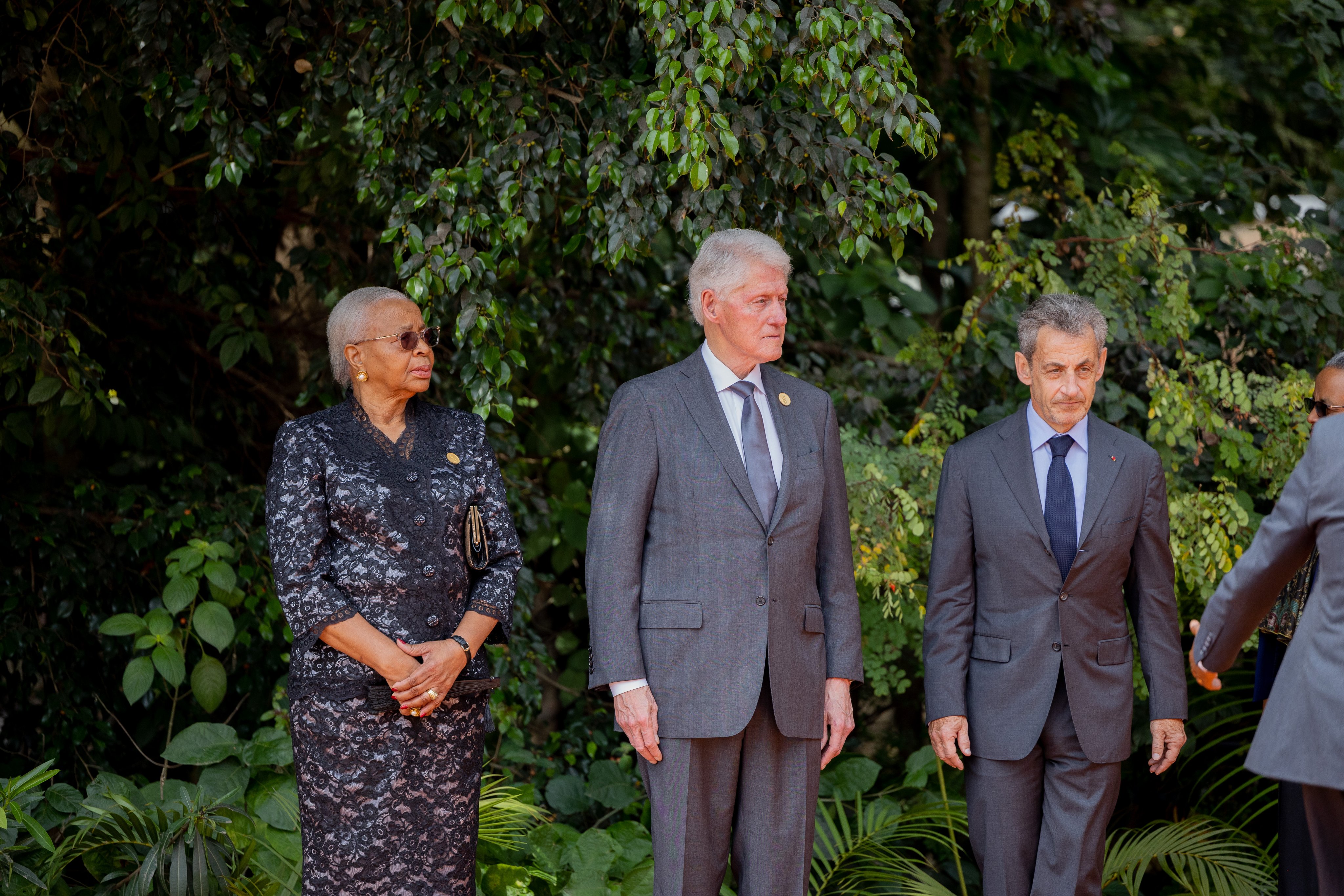 Bill Clinton wabaye Perezida wa Leta Zunze Ubumwe za Amerika mu 1993 kugeza mu 2001 (Uri hagati) na Nicolas Sarkozy wabaye Perezida w'u Bufaransa (Uri iburyo) ari mu bitabiriye umuhango wo gutangiza ibikorwa byo #Kwibuka30