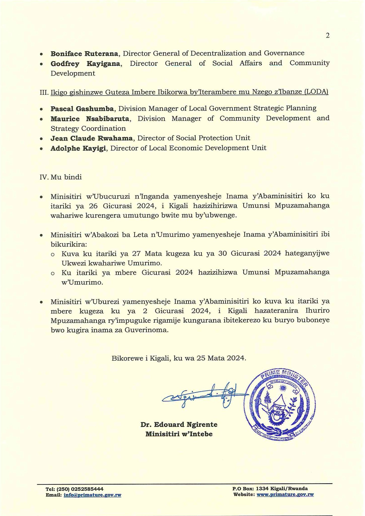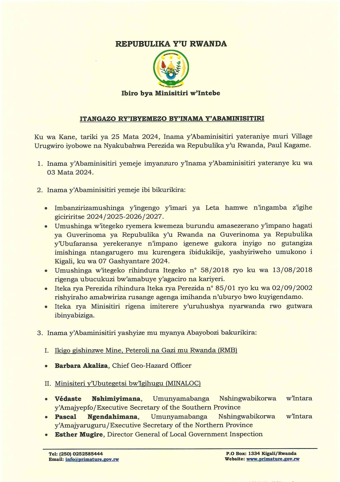 Ibyemezo by'Inama y'abaminisitiri yo kuwa Kane tariki ya 24 Mata 2024