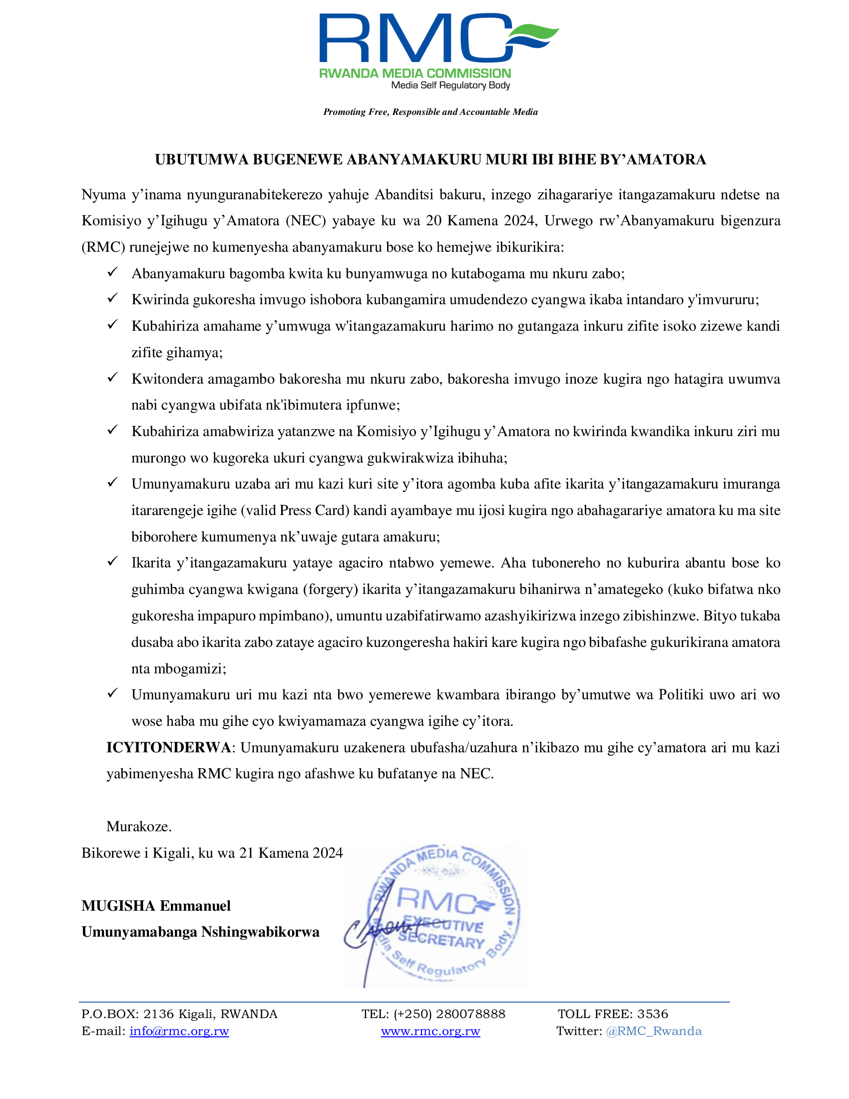 Abanyamakuru kandi, basabwe kubahiriza amabwiriza yatanzwe na Komisiyo y'Igihugu y'Amatora no kwirinda kwandika inkuru ziri mu murongo wo kugoreka ukuri cyangwa gukwirakwiza ibihuha.