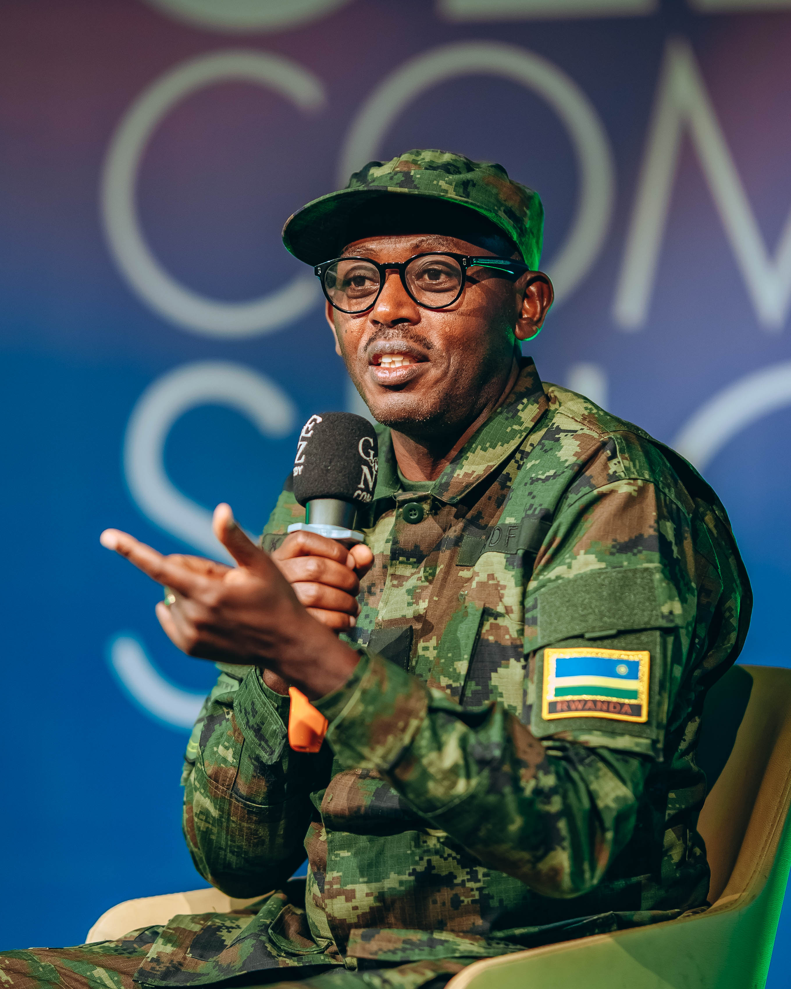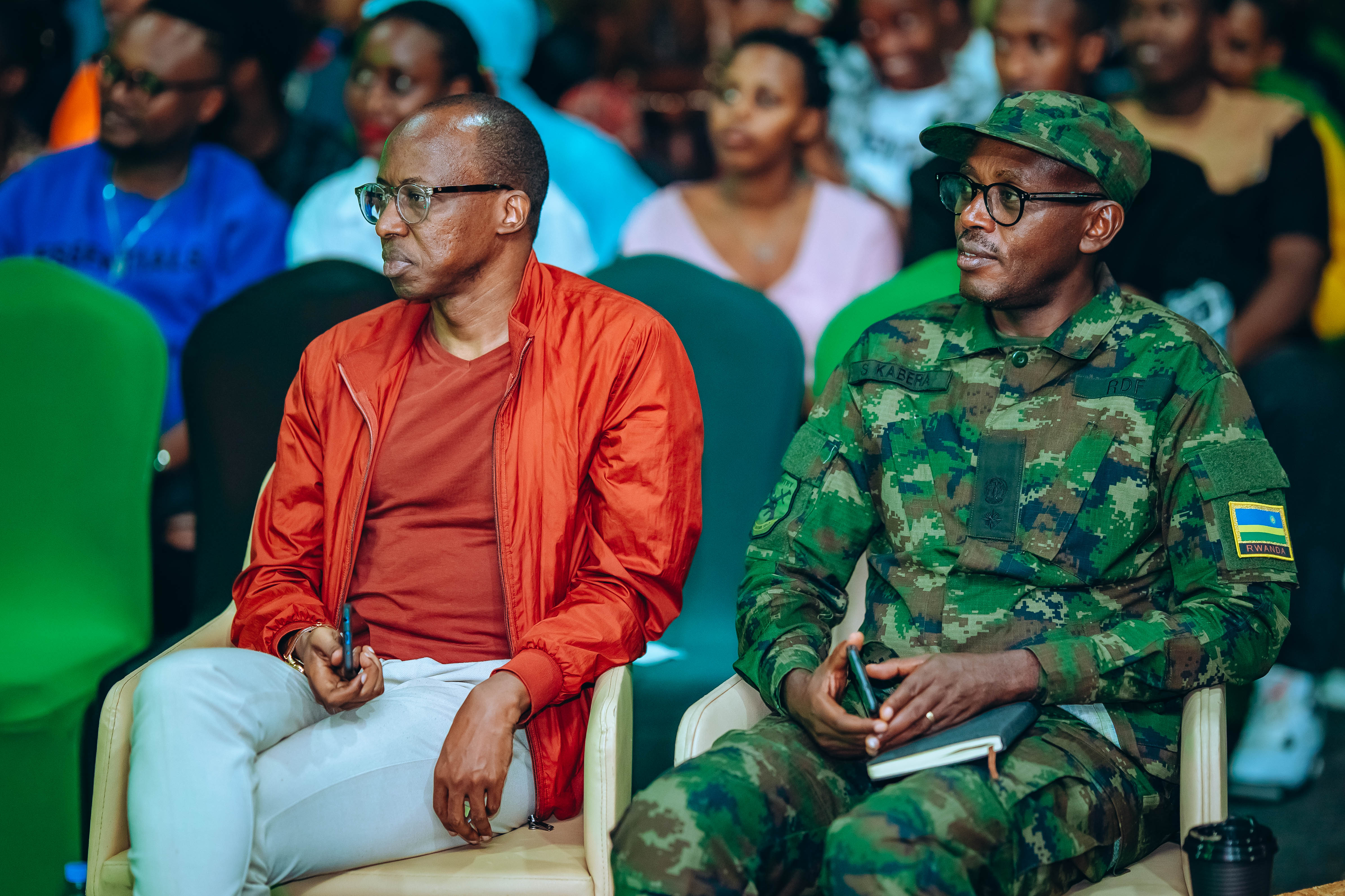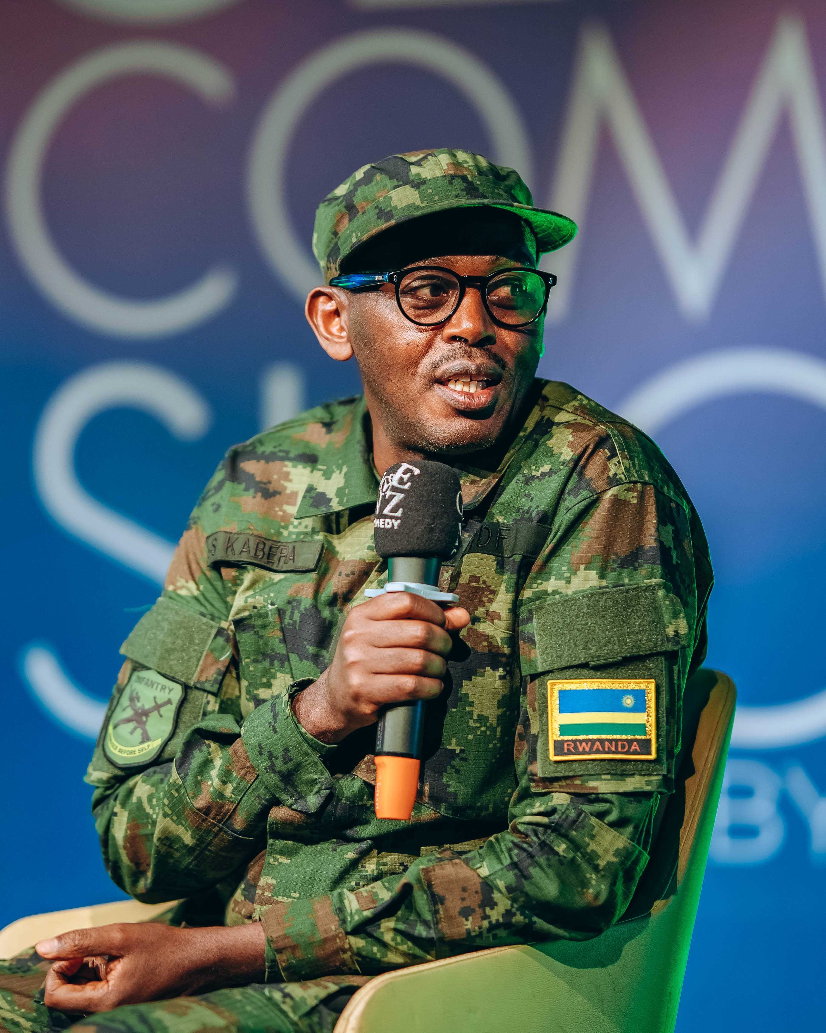 Lt Col Simon Kabera ubwo yaganiraga na Fally Merci utegura ibitaramo bya ‘Gen-Z Comedy’ binyuze mu gace kazwi nka “Meet me Tonight "