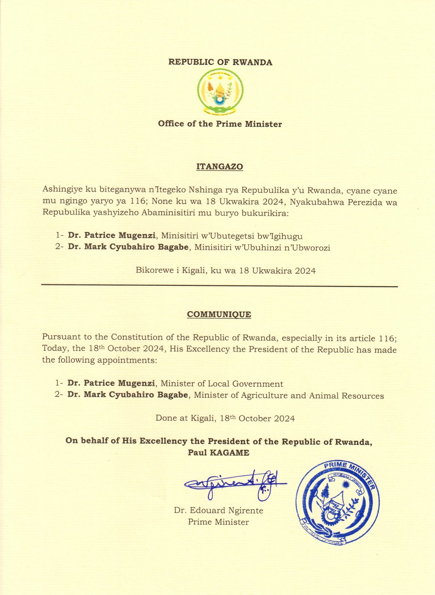 Dr Patrice Mugenzi wahawe kuyobora MINALOC, asimbuye Eng. Jean Claude Musabyimana wari umaze imyaka ibiri muri izi nshingano yari yarahawe n'Umukuru w'Igihugu tariki 10 Ugushyingo 2022. Dr. Mark Cyubahiro Bagabe, yagizwe Minisitiri w'Ubuhinzi n'Ubworozi akaba yasimbuye Dr Ildephonse Musafiri.