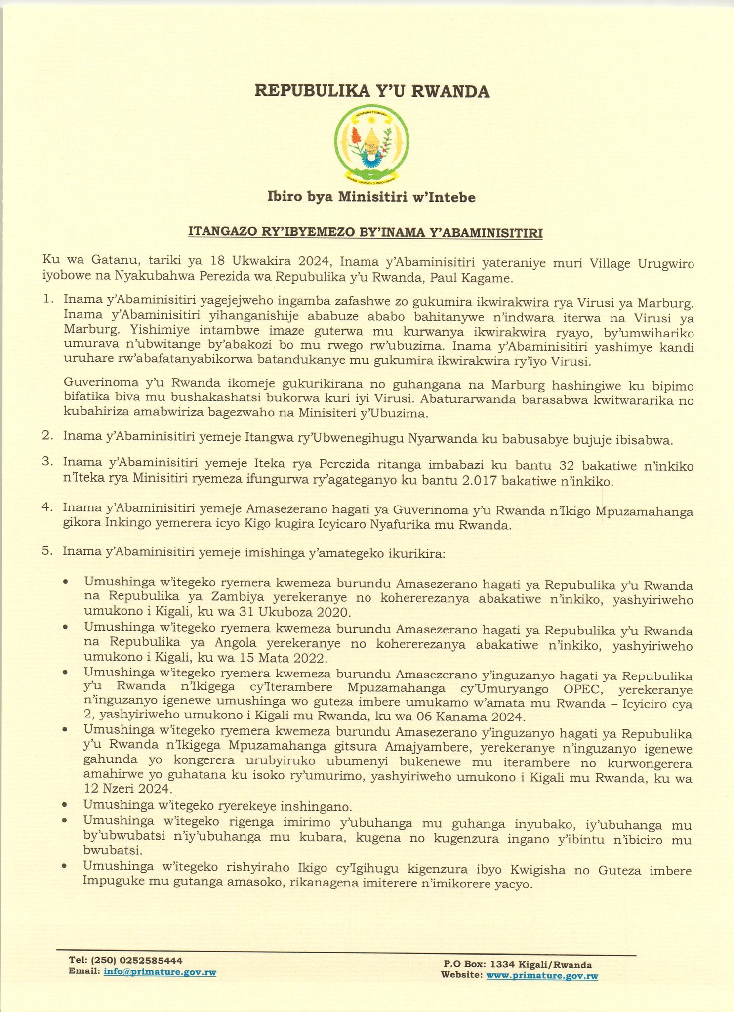Inama y'Abaminisitiri yagejejweho ingamba zafashwe zo gukumira ikwirakwira rya Virus ya Marburg. Inama y'Abaminisitiri yihanganishije ababuze ababo bahitanywe n'indwara iterwa na Marburg. Yishimiye intambwe imaze guterwa mu kurwanya ikwirakwira ryayo, by'umwihariko umurava n'ubwitange by'abakozi bo mu rwego rw'ubuzima.