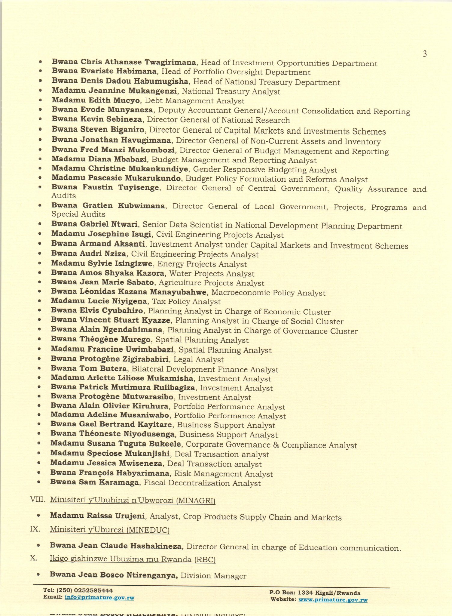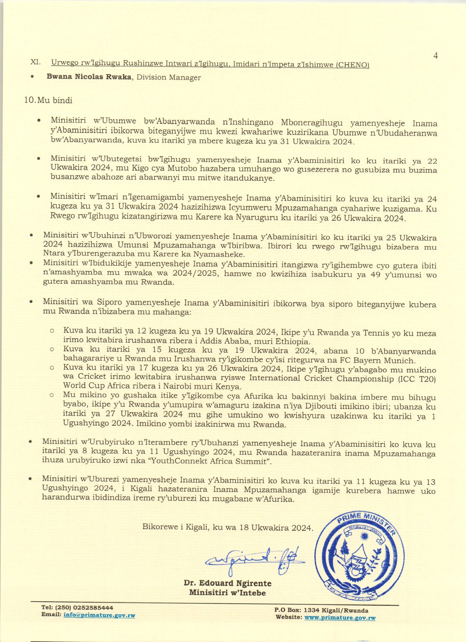 Undi wahawe inshingano nshya n'Umukuru w'Igihugu ni Aurore Mimosa Munyangaju wari Minisitiri wa Siporo uherutse gusimburwa na Nyirishema Richard, akaba yagizwe Ambasaderi w'u Rwanda muri Luxembourg. Eng Patricie Uwase wari Umunyamabanga wa Leta muri Minisiteri y'Ibikorwaremezo, yagizwe Umuyobozi Mukuru wa Rwanda Cooperation Initiative.