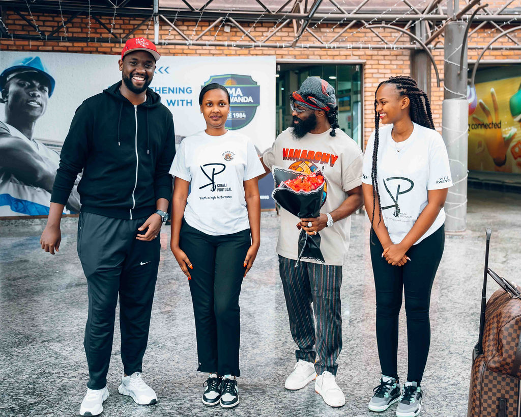Yageze ku kibuga cy’indege Mpuzamahanga cya Kigali, mu gitondo cyo kuri uyu wa Kane tariki 26 Ukuboza 2024, yakiwe n’umuyobozi wungirije muri 1:55 AM, Kenny Mugarura, ndetse n’abakobwa babarizwa muri Kigali Protocol, bamuha ikaze.