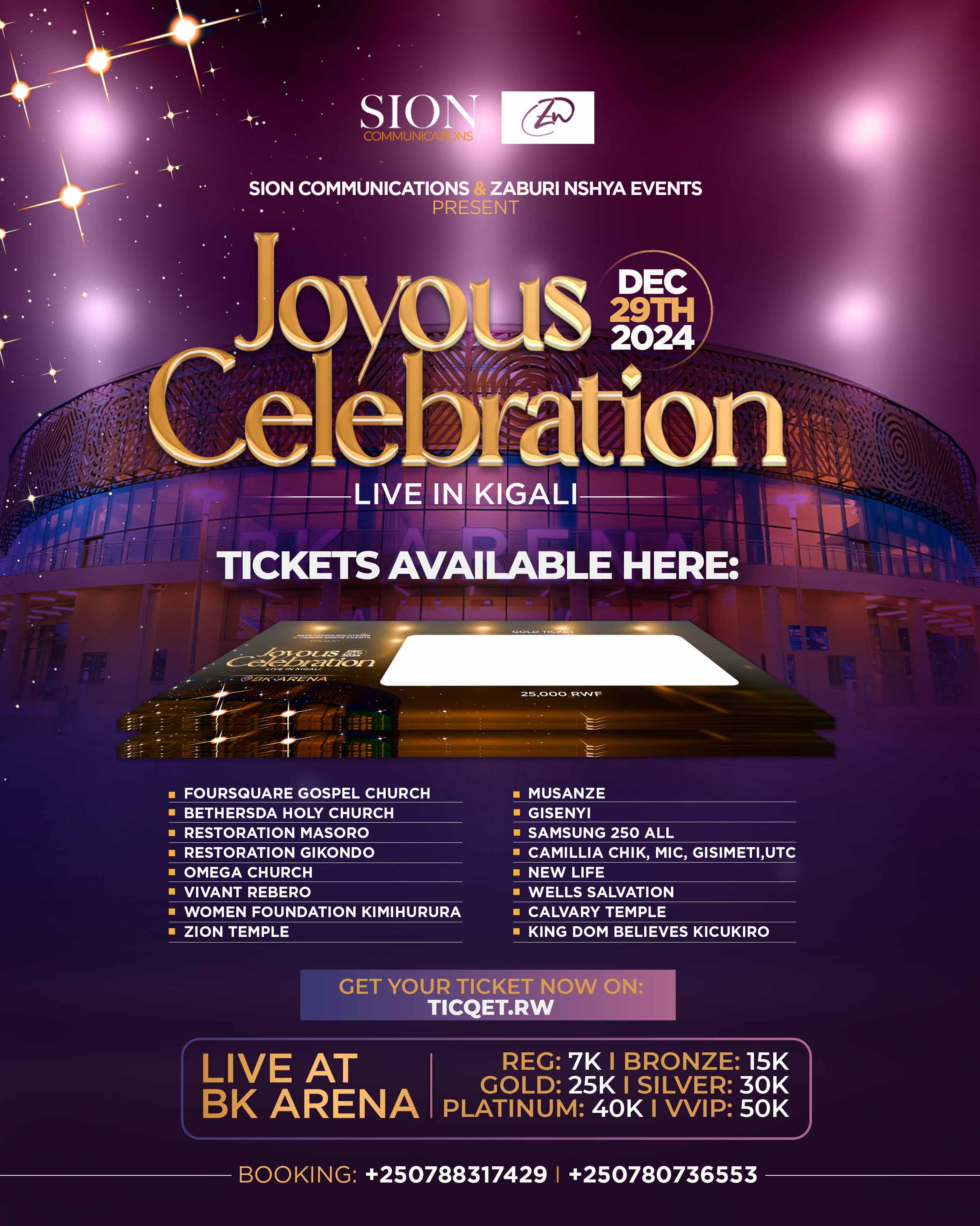 Amatike yo kwinjira muri iki gitaramo cy'akataraboneka, aracyari ku isoko ariko isaha n'isaha yashira. Nyura kuri www.ticqet.com ugure itike yawe. Wanayasanga ku nsengero zitandukanye ndetse no kuri Camellia zose na Samsung 250 zose.