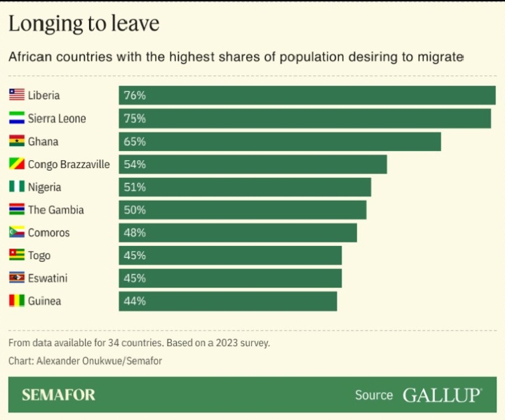 Ubu bushakashatsi bugaragaza ko Liberia ari yo ifite abaturage benshi bashaka kwimuka, aho 76% by’abaturage bayo batangaje ko bifuza kuva mu gihugu, ikurikirwa na Sierra Leone ifite 75%. Ibindi bihugu bifite umubare munini w’abaturage bashaka kwimuka ni Ghana (65%), Congo-Brazaville (54%) na Nigeria (51%).