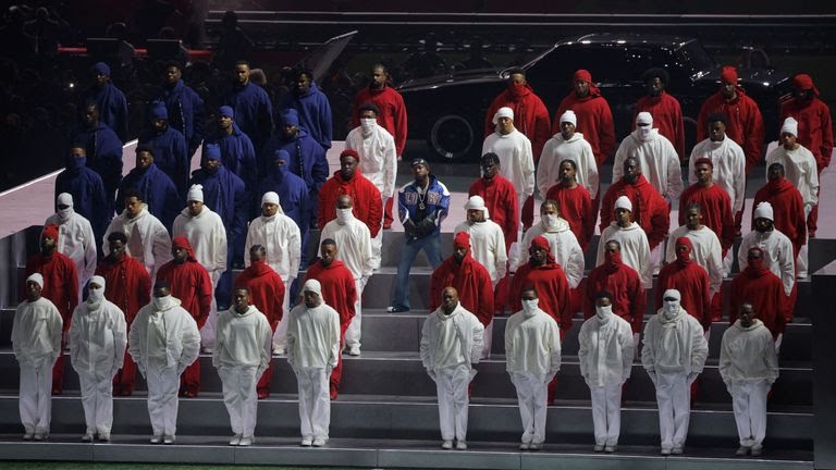 Ubwo igice cya mbere cyari kirangiye, umuraperi Kendrick Lamar ni we wasusurukuje abari kuri uyu mukino aho yaririmbye indirimbo ze zikunzwe cyane zirimo Not Like Us, Humble ndetse n'inzindi.