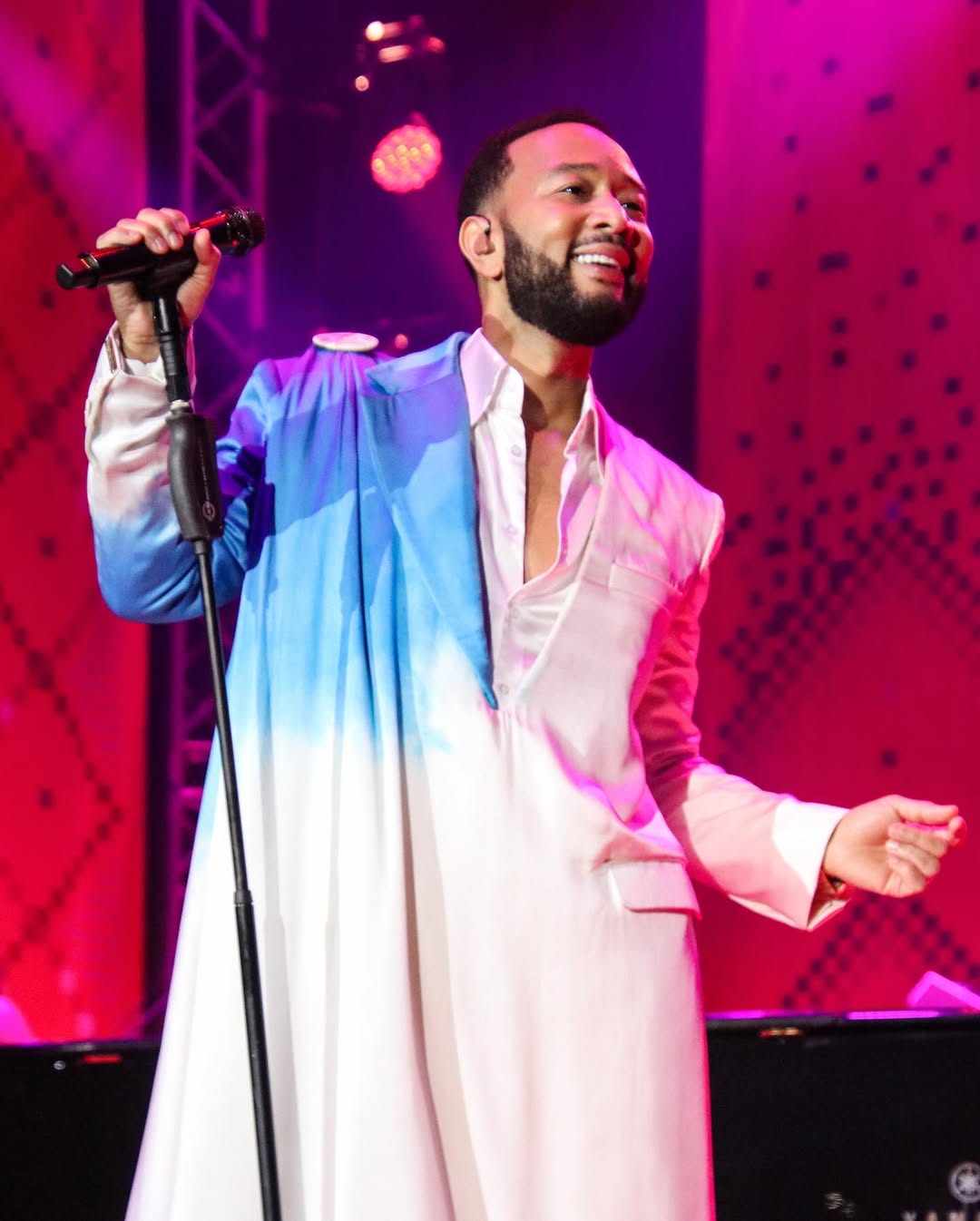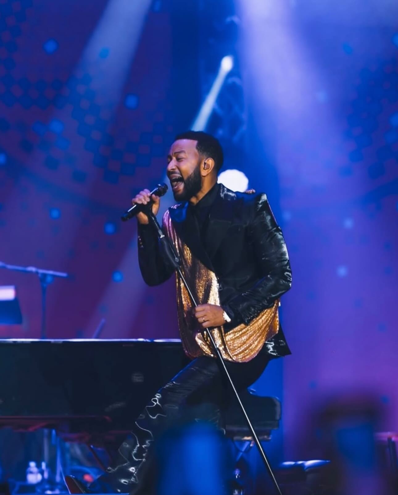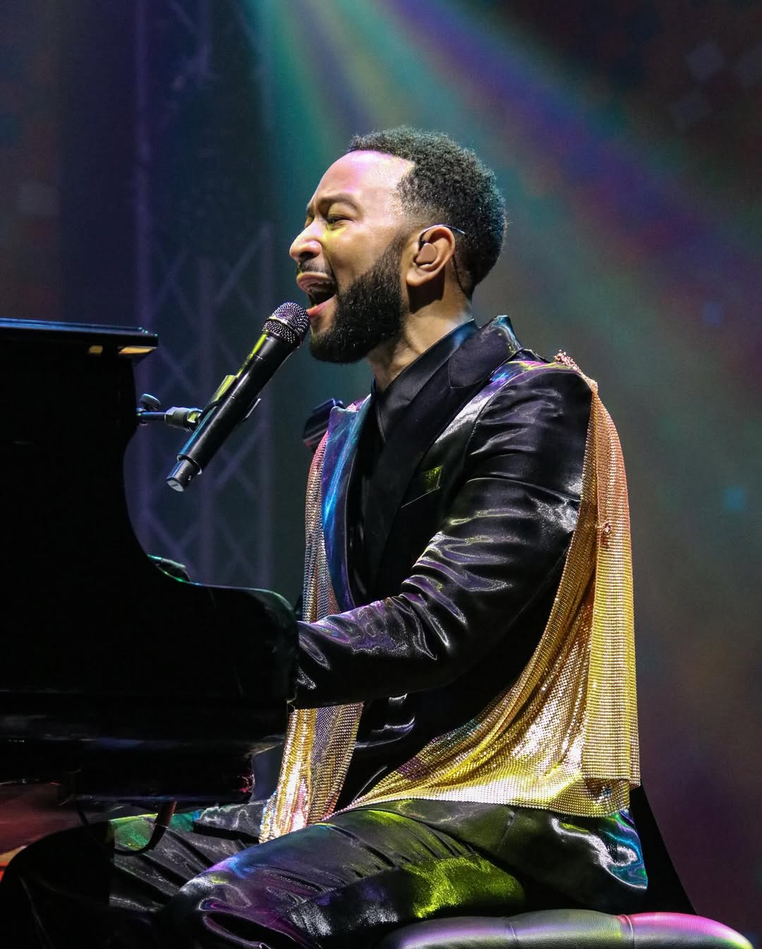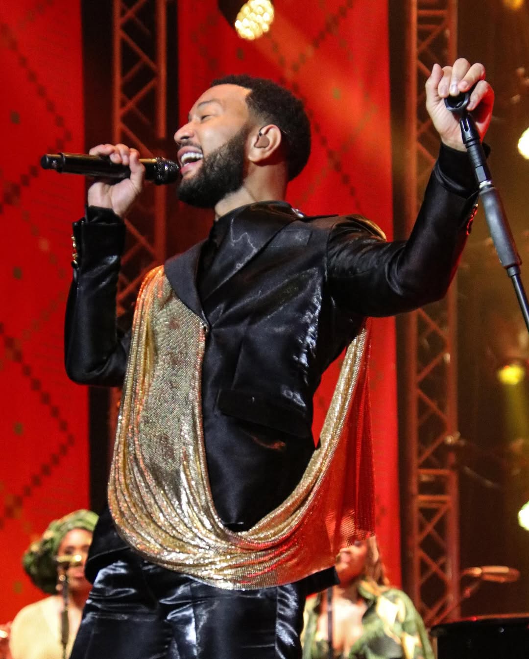 Mu gice cya kabiri John Legend yagiye kuruhuka agarukana ikoti ry’umukara rifite umwitero w’ibara rishashagirana nka zahabu.