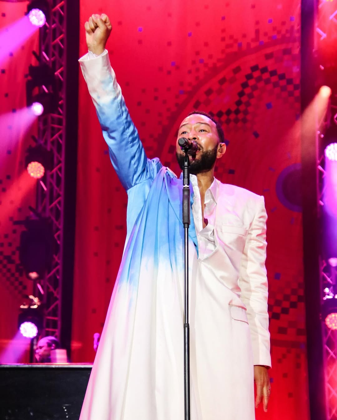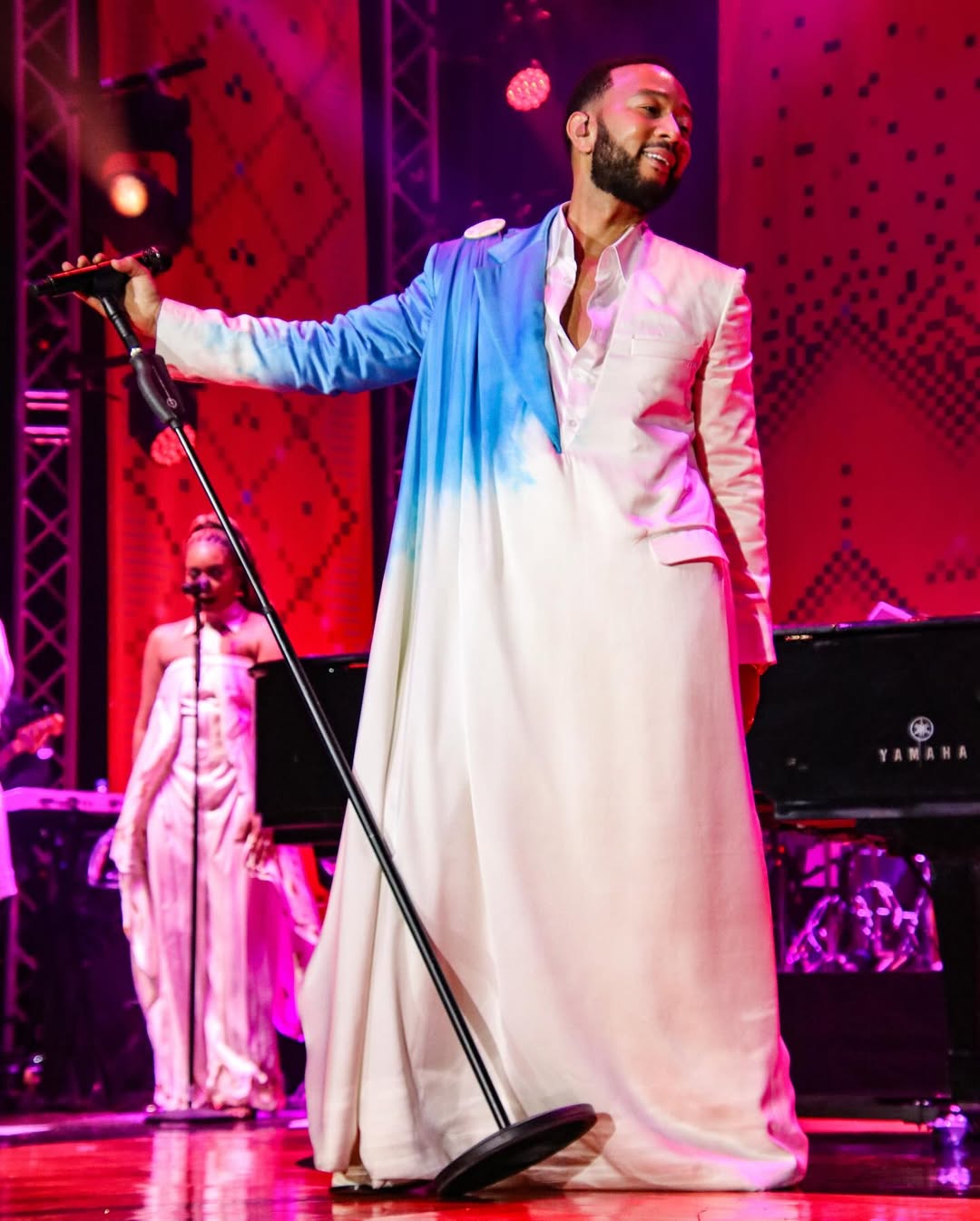 Umwambaro w’ibara ry’umweru n’ubururu buke ku rutugu rw’iburyo ukoze nk’ikoti rifite umwitero wahitiwemo John Legend witwa “Shana Dress Jacket " ufite agaciro ka miliyoni 3Frw nk’uko bigaragara ku rubuga rwa Moshions. Uyu niwo mwambaro John Legend yaserukanye mu gice cya mbere cy’igitaramo.
