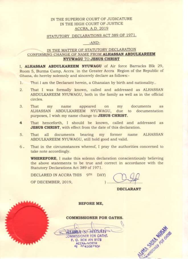 Iyo nyandiko yerekana ko ari umunyagihugu wa Ghana kandi yavukiye muri Ghana. Abdulkareem, ubu uzwi ku izina rya Jesus Christ, yasabye ubayobozi ko bandika amazina ye mashya n’ibindi byangombwa bye bigahindurwa, nk'uko tubikesha ikinyamakuru Modern Ghana.