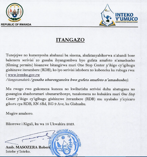 Bagize bati "Tunejejwe no kumenyesha abahanzi ba sinema, abafatanyabikorwa n'abandi bose bakenera serivisi zo gusaba ibyangombwa byo gufata amafoto n'amashusho bisanzwe bitangirwa muri One Stop Center y'Ikigo cy'Igihugu Gishinzwe Iterambere (RDB); ko iyi serivisi ishobora no kuboneka ku rubuga rwa irembo."