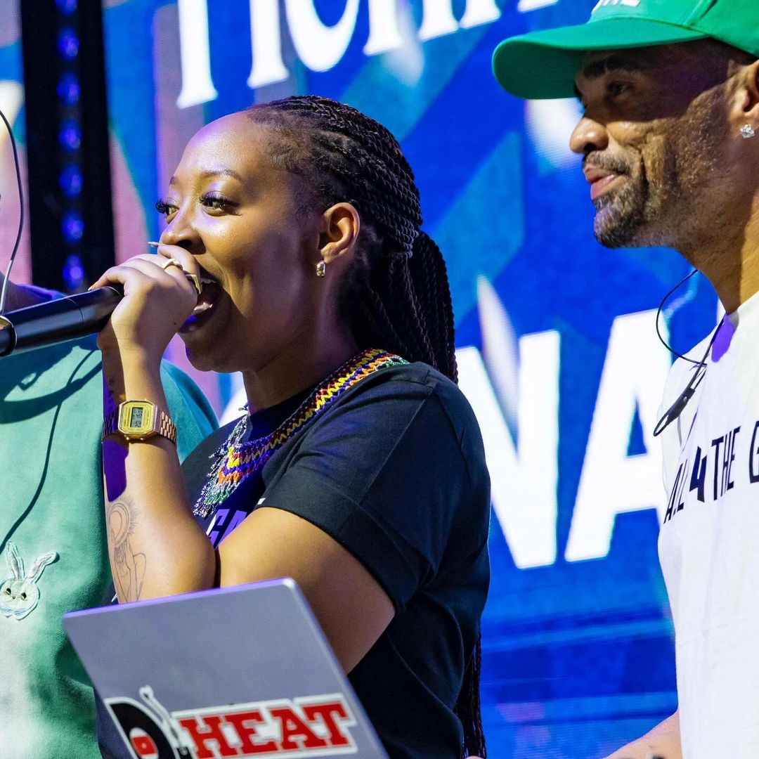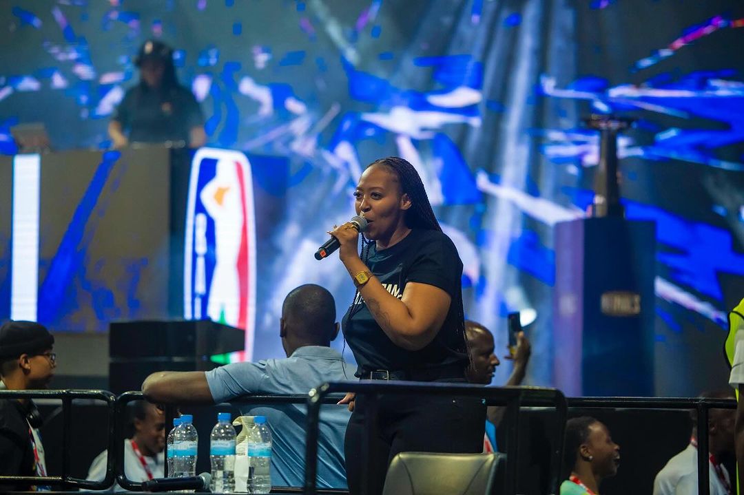 Zuba Mutesi aha yari kumwe na Slimdope umunyafurikay'Epfo bari gufatanya kuyobora ibikorwa bya BAL muri BK Arena