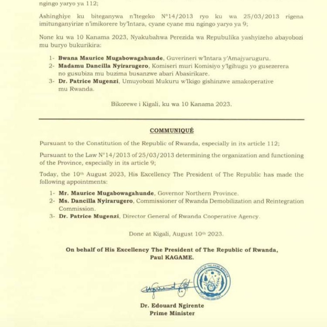 Itangazo dukesha ibiro bya Minisitiri w'Intebe ryo kuri uyu wa Kane tariki ya 10 Kanama 2023, ryasinyweho na Minisitiri w'Intebe Dr Edouard Ngirente mu izina rya Nyakubahwa Perezida wa Repubulika Paul Kagame;
