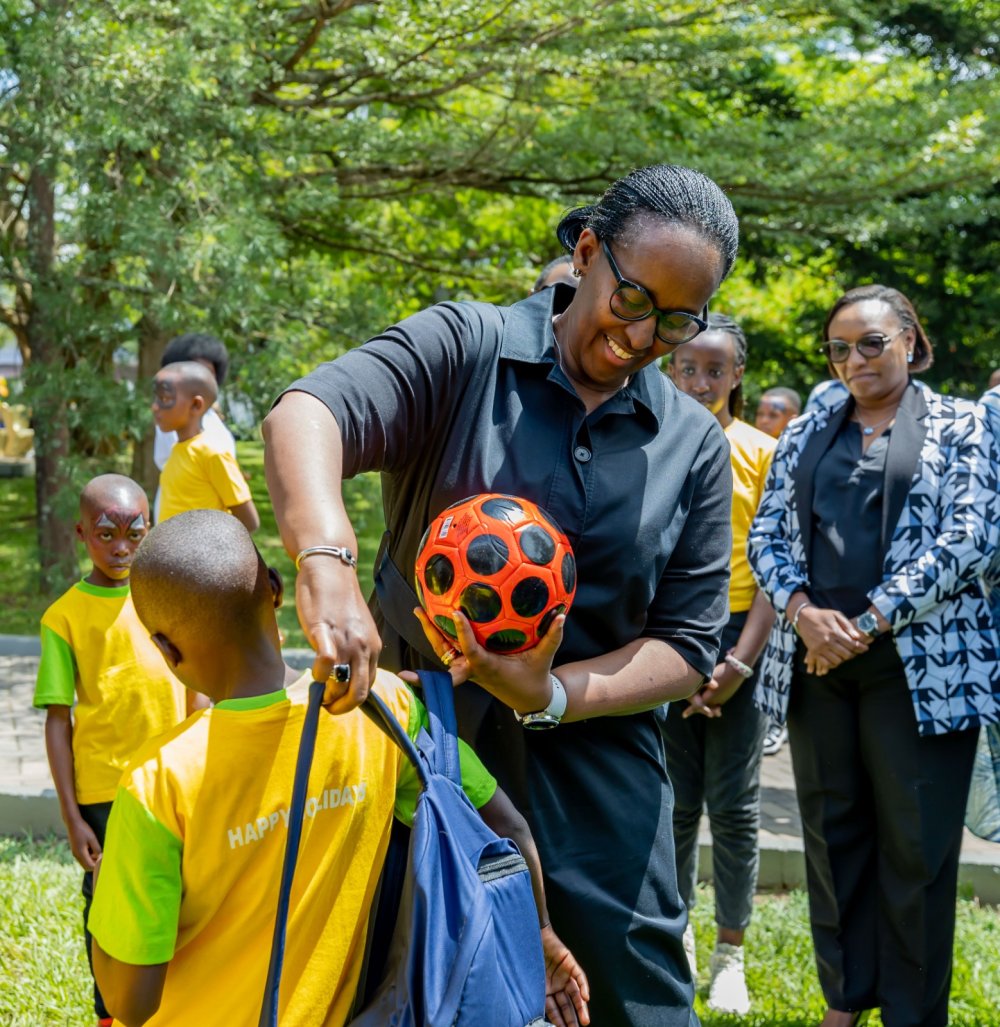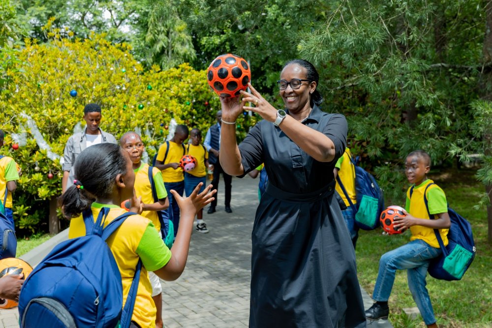 Mu mafoto yagiye hanze wabonaga aba bana ibyishimo byabarenze, berekana impano zitandukanye gusa icyanyuze benshi kurushaho ni amashusho ya Madamu Jeannette Kagame ari gukina imipira mitoya n'aba bana.