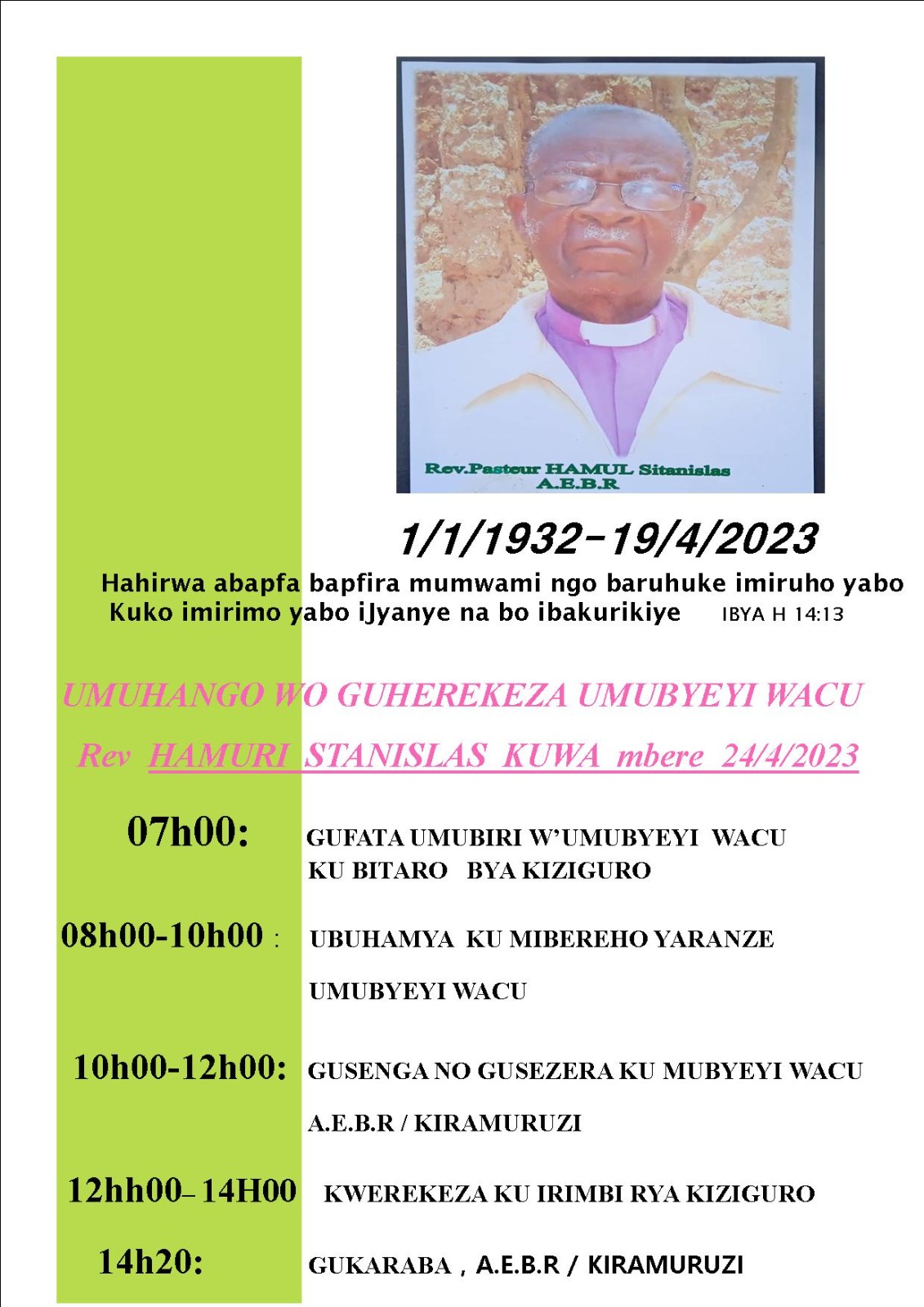 Rev. Hamuri Stanislas azashyingurwa kuwa Mbere tariki 24/04/2023 ku irimbi rya Kiziguro mu Karere ka Gatsibo mu Ntara y'Iburasirazuba.