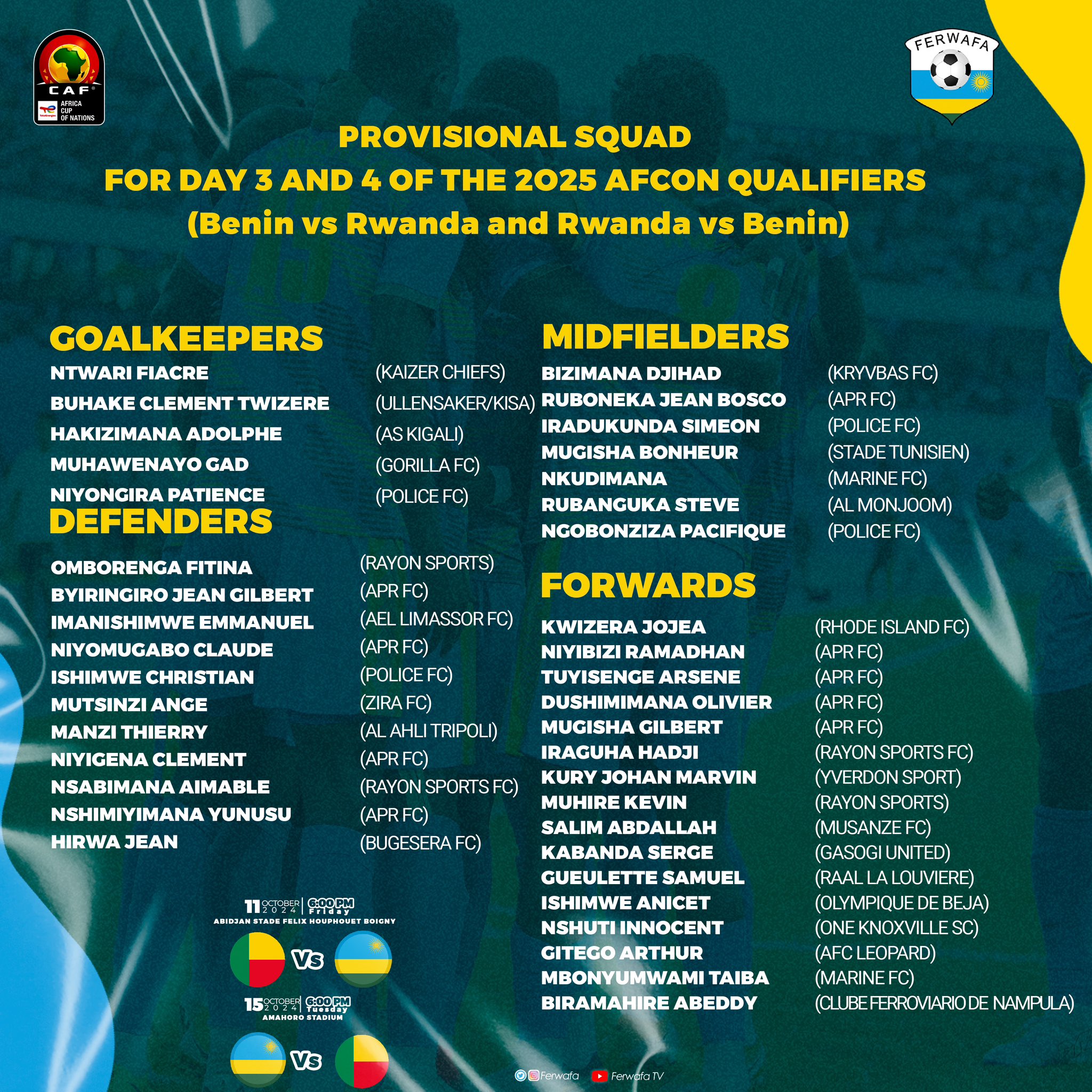 Ku gicamunsi cyo kuri uyu wa Gatanu tariki 27 Nzeri 2024 ni bwo Umutoza w’Ikipe y’Igihugu, Frank Spittler, yashyize ahagaragara urutonde rw’abo yifuza kuzakinisha muri iyi mikino binyuze mu kiganiro yagiranye n'itangazamakuru.