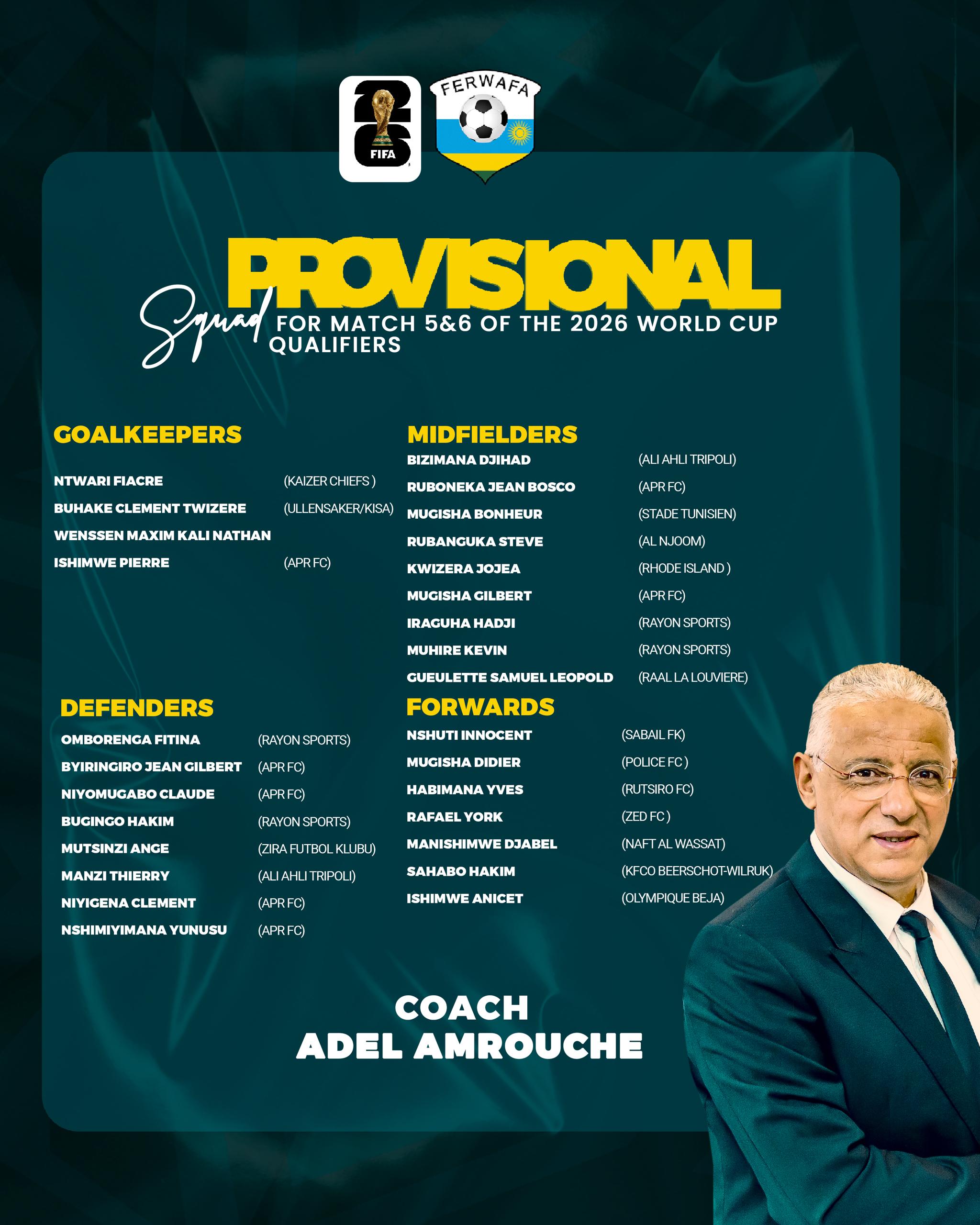 Ni urutonde rwagiye hanze ku mugoroba wo kuri uyu wa Gatandatu tariki ya 15 Werurwe 2025. Aba ni abakinnyi bazakina umukino wa Nigeria tariki ya 21 Werurwe ndetse na Lesotho tariki ya 25 Werurwe muri Stade Amahoro.