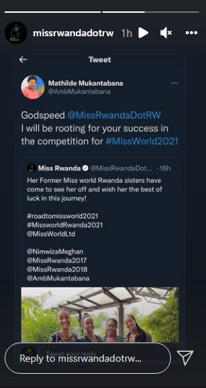 Akoresheje amagambo y’icyongereza yagize ati:"Godspeed @MissRwanda I will be rooting for your success in the competition for #MissWorld." Mu Kinyarwanda akaba yagize ati:"Amahirwe masa mu rugendo mutangiye Nyampinga w’u Rwanda nzababa hafi ku bw’intsinzi yanyu mu marushanwa ya Nyampinga w’isi."