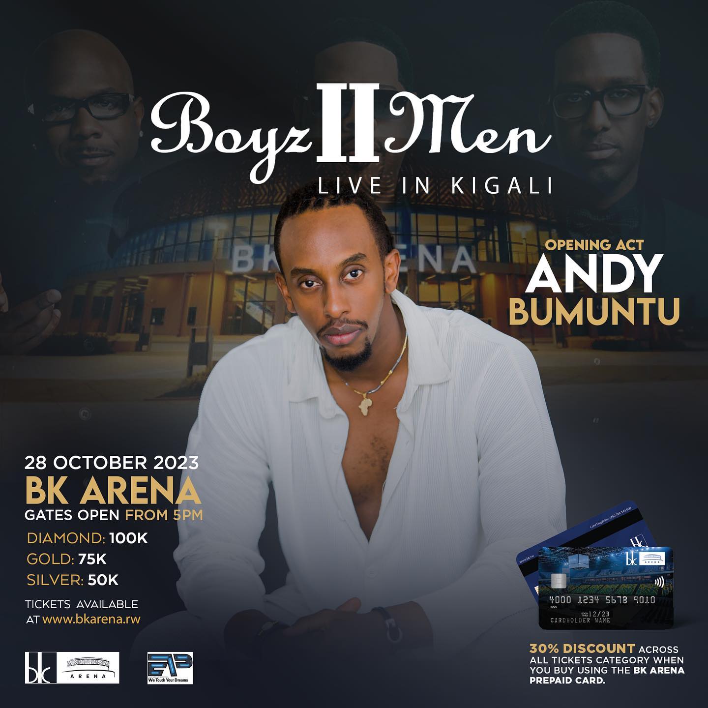 Andy Bumuntu azaririmba afungura ku mugaragaro iki gitaramo gikosha mu bijyanye n’ibiciro byo kucyinjiramo. Ibiciro byo kwinjira muri iki gitaramo cya Boyz II Men byashyizwe mu byiciro bitatu: Itike yiswe 'Diamond' iragura ibihumbi 100Frw, itike yiswe 'Gold' iragura 75,000Frw n’aho itike yiswe 'Silver' igura 50,000 Frw.