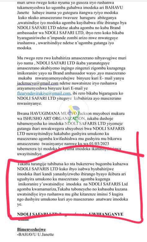 “Ayo masezerano mukaba mwarayamenyeshejwe binyuze kuri E- mail yanyu jackmucyo@gmail.com ndetse n’uwatsinze iryo rushanwa arayamenyeshwa binyuze kuri E-mail ye fleuryndayirukiye@gmail.com, ibi rero bikaba bigaragaza ko NDOLI SAFARIS LTD yiteguye kubahiriza ayo masezerano mwasinyanye."