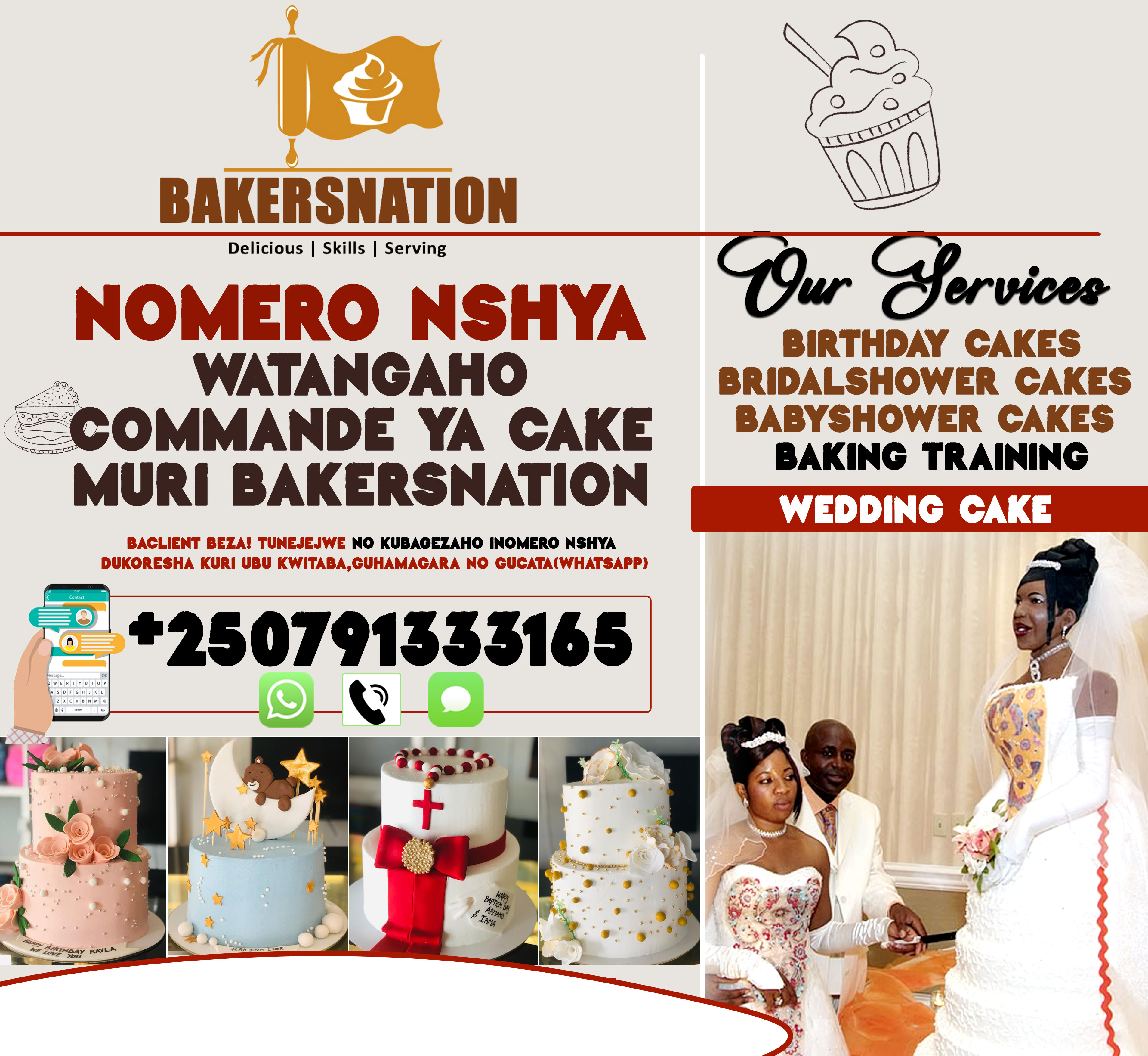 Abafite ubukwe namwe muhawe ikaze, kuri ubu BAKERSNATION igufasha gutegura cake nziza iryoshye mu birori by’ubukwe bwawe, bakayikuzanira aho ibirori bibera, iherekejwe kandi n’umukozi ufite inararibonye ku buryo umutekano wayo uba wizewe, n'ibikoresho bijyanye n’uburyo bwiza bwo kuyitegura mu birori, Champagne, icyuma cyo kuyikata na fireworks.