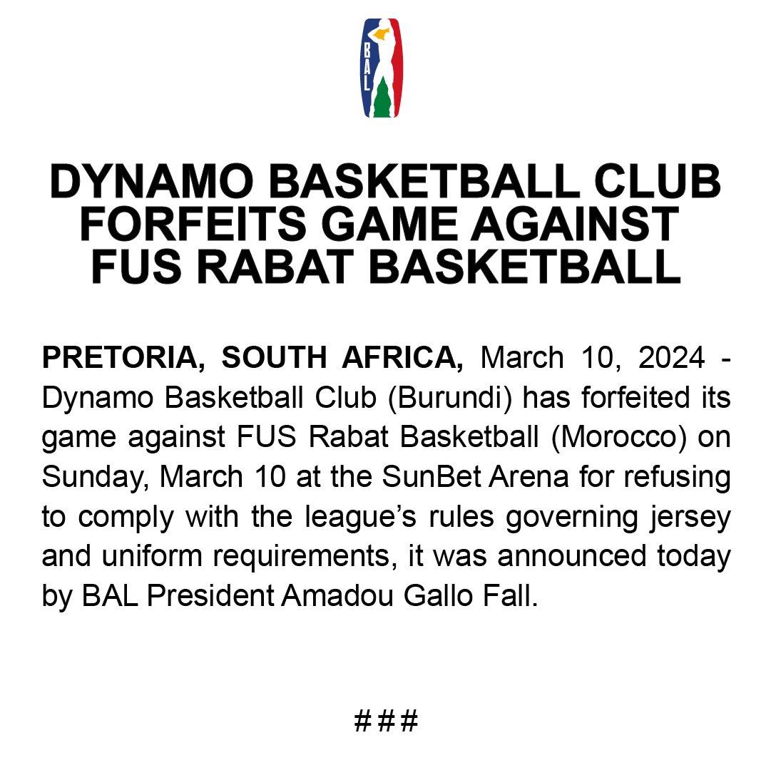 Mu itangazo ryashyizwe ku mbuga nkoranyambaga za BAL , rivuga ko umwanzuro wo gutera mpaga ikipe ya Dynamo Basketball Club , waje nyuma y'uko iyi kipe yanze kubahiriza amabwiriza , agenga irushanwa , byumwihariko ibwiriza rijyana n'imyambaro amakipe agomba kwambara mu gihe cy'umukino.