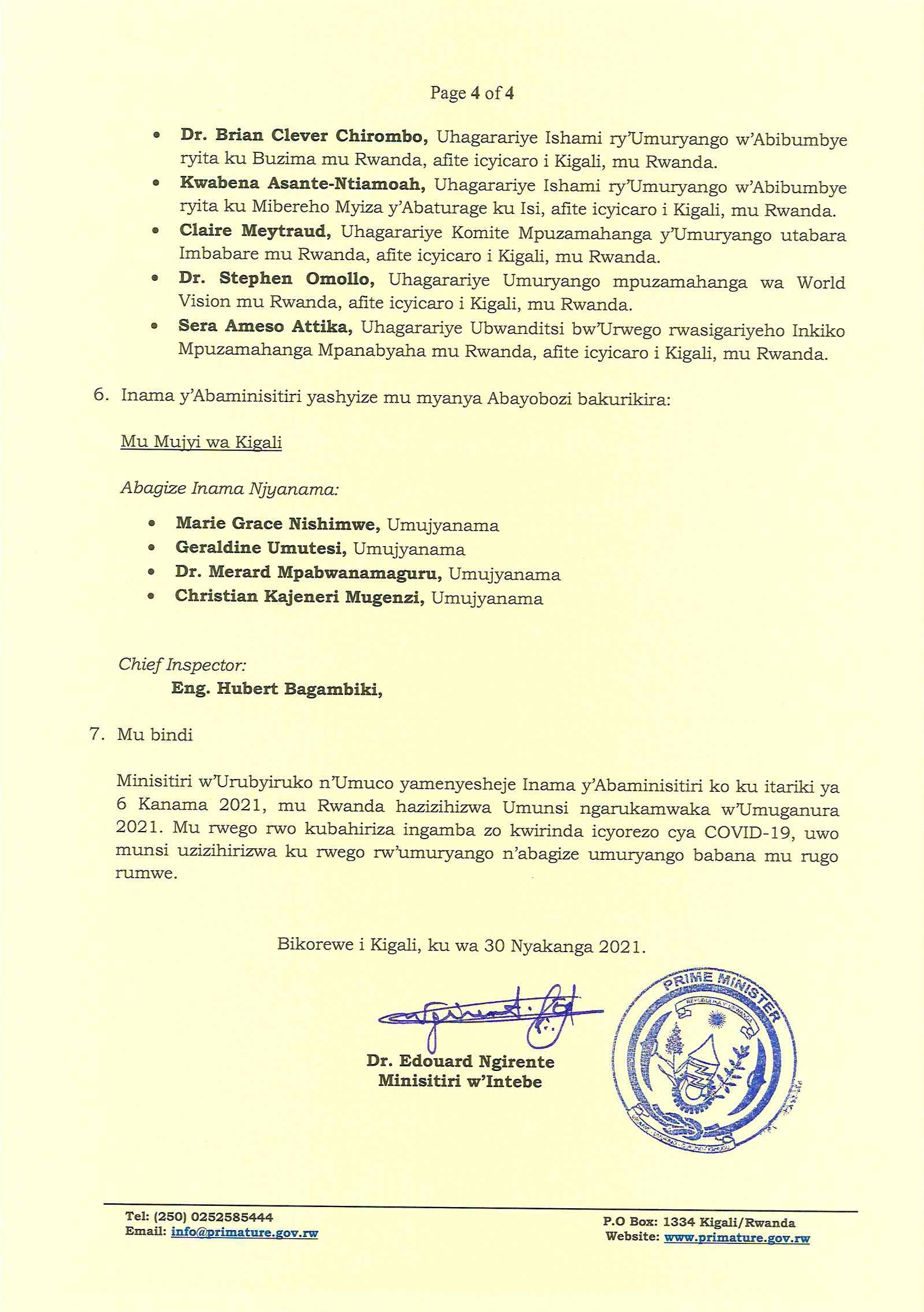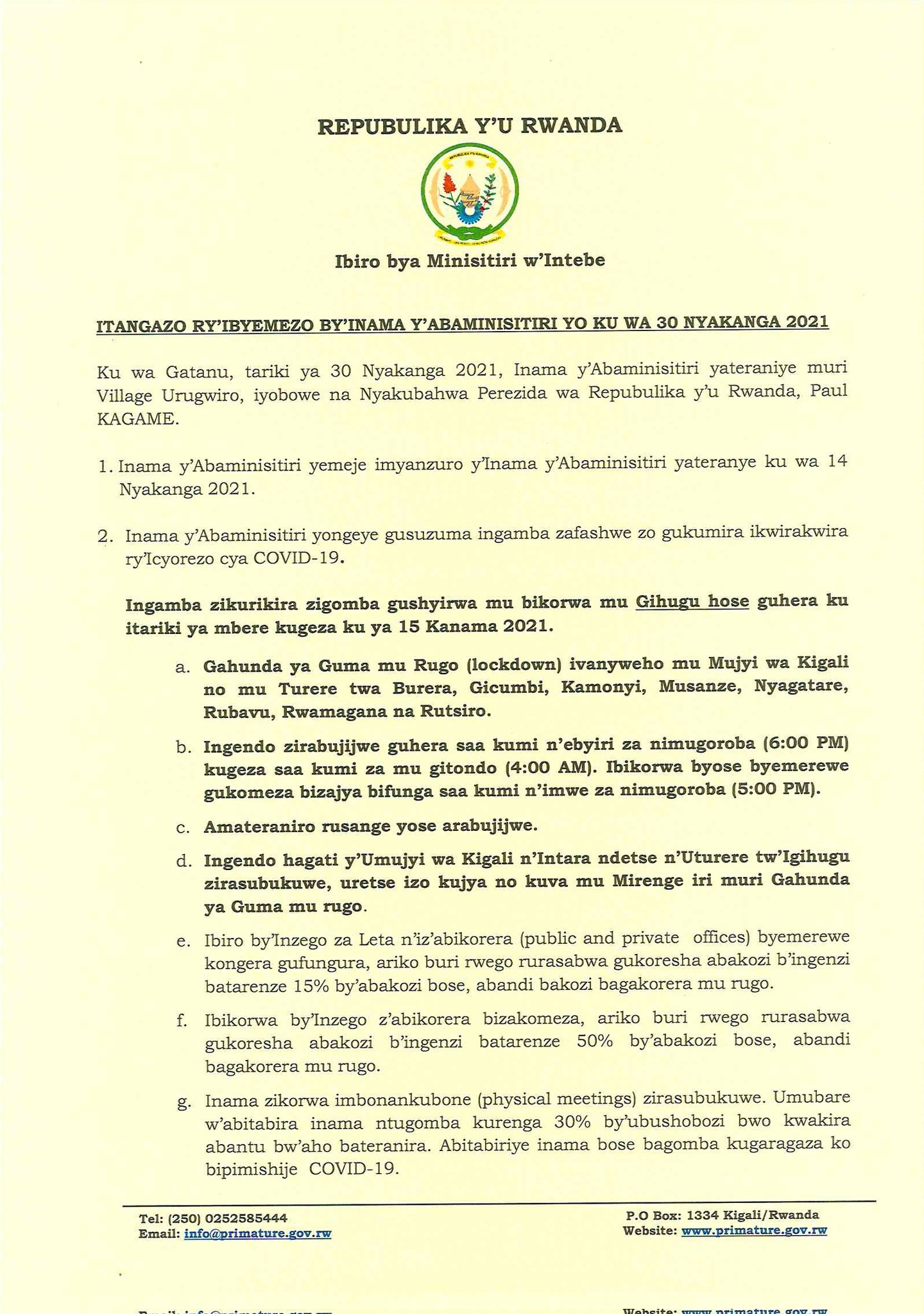 Iyi nama yemeje ko Guma mu rugo ivanyweho mu mujyi wa Kigali no mu Turere 8 ari two: Burera, Gicumbi, Kamonyi, Musanze, Nyagatare, Rubavu, Rwamagana na Rutsiro. Yemeje kandi ko ingendo zibujijwe guhera saa kumi n'ebyiri za nimugoroba kugeza saa kumi za mu gitondo. Ibikorwa byose byemerewe gukora, bizajya bifunga saa kumi n'imwe za nimugoroba. Amateraniro rusange yose arabujijwe.