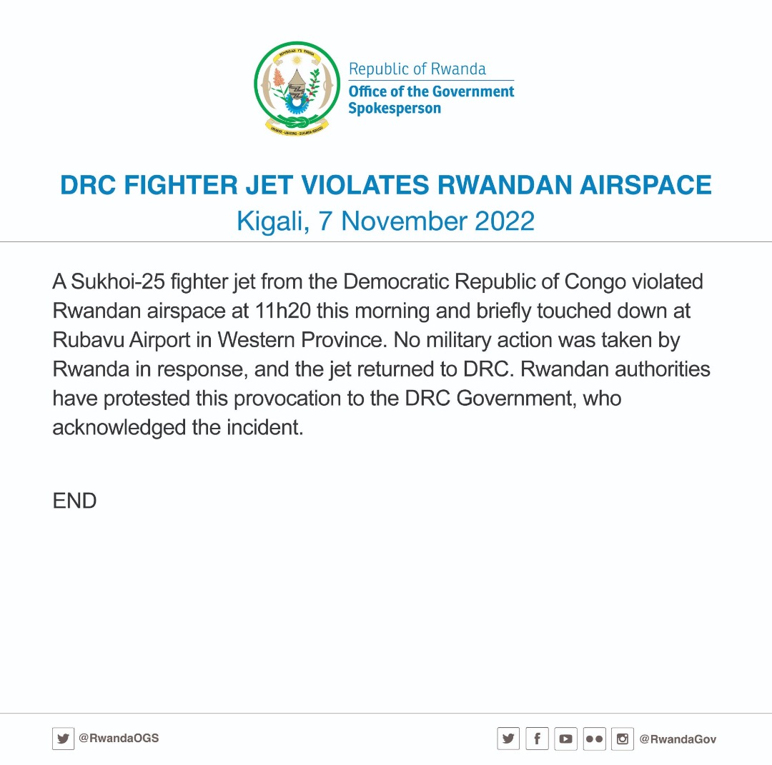 Mu itangazo ryashizwe ahagaragara mu masaha y'igicamunsi, havuzwe ko indege y'intambara ya A Sukhoi-25 yavuye muri DRCongo ikinjira mu Rwanda i Saa 11:20 ndetse igaparika ku kibuga cy'indege cya Rubavu umwanya muto mbere yo gusubira aho yaturutse.